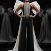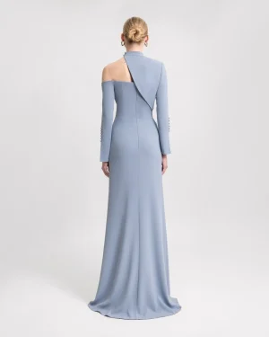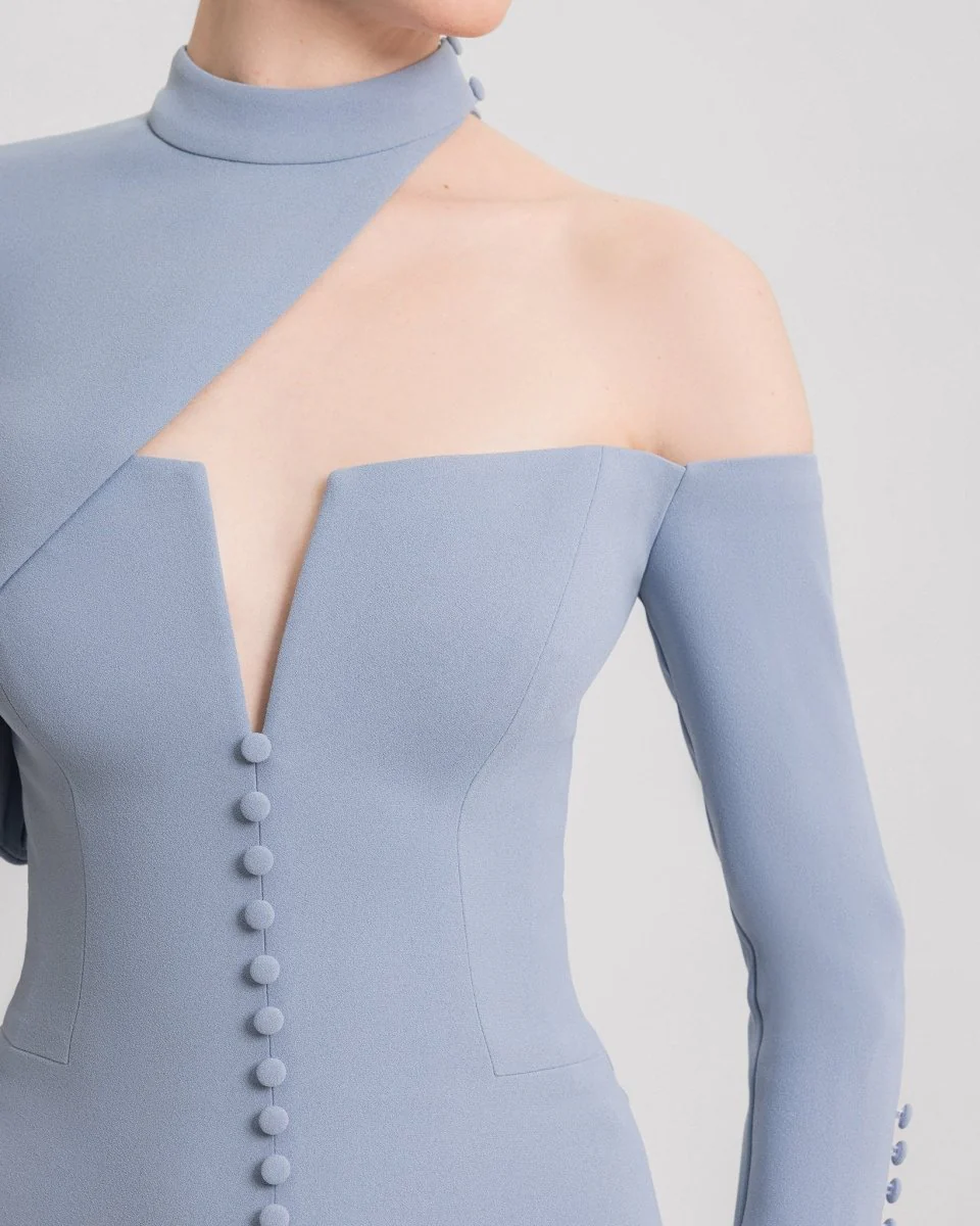 Off-the-shoulders dress paired with asymmetrical top, featuring a buttoned down front and a slit in the middle.