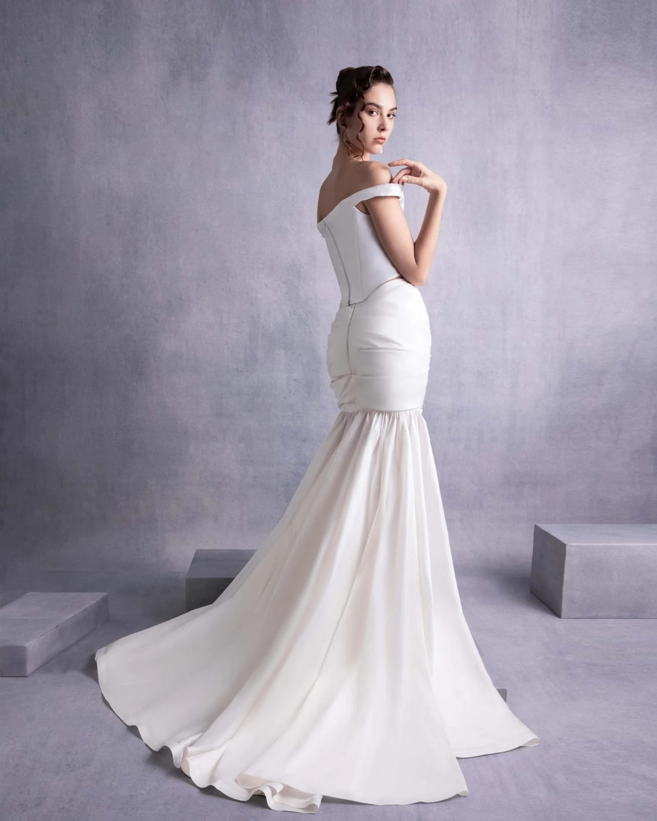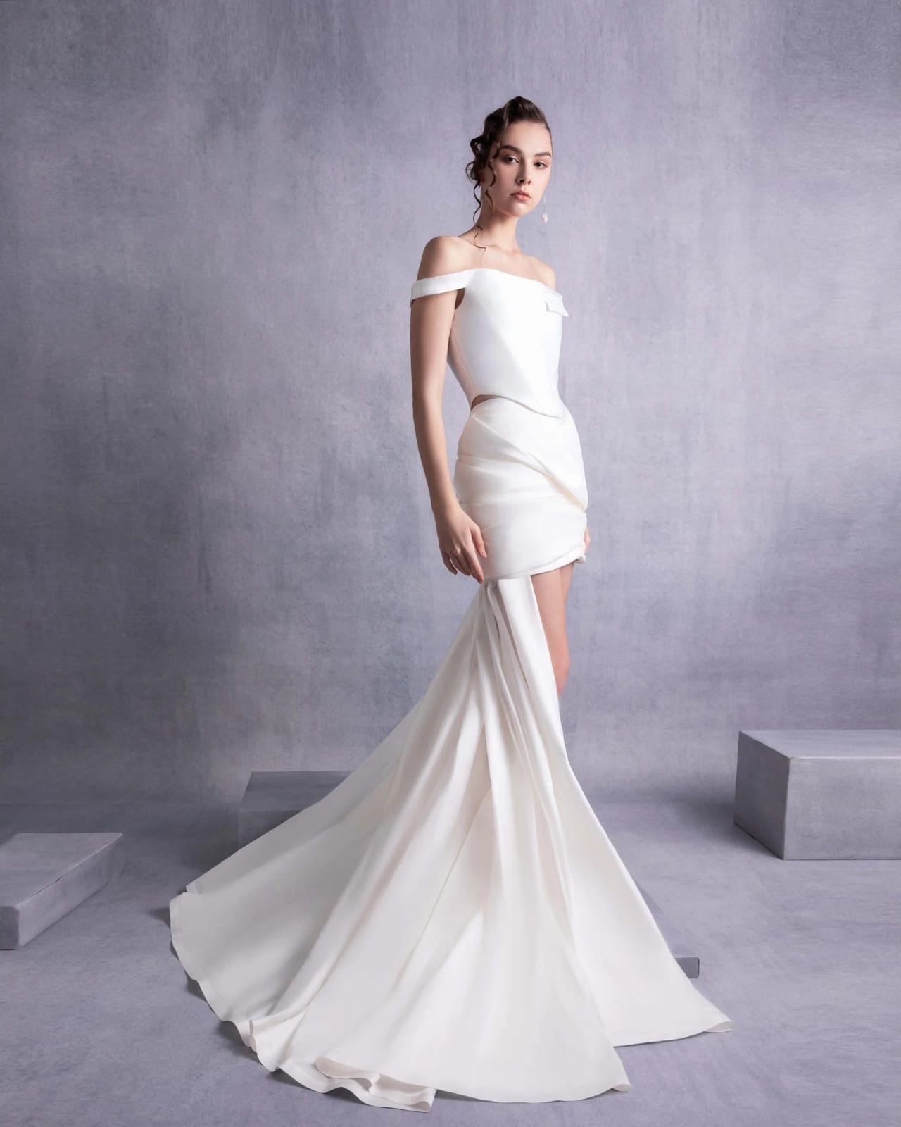 A sophisticated off-shoulder piqué corset top designed to flatter the silhouette with a structured fit. The minimal yet elegant design features clean lines and a refined texture, making it perfect for modern evening wear.