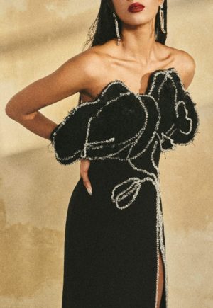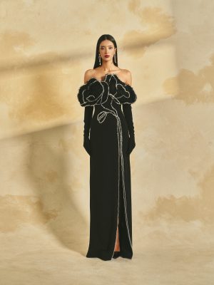 Off- shoulder maxi dress with a front slit, and long gloves.