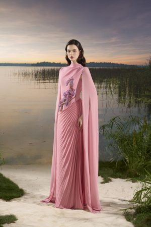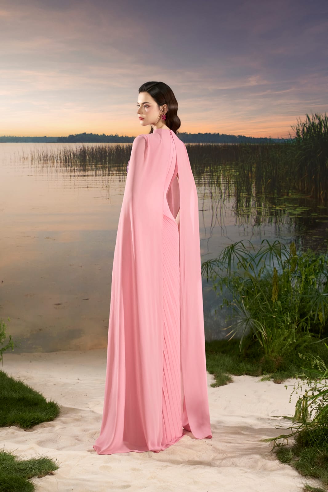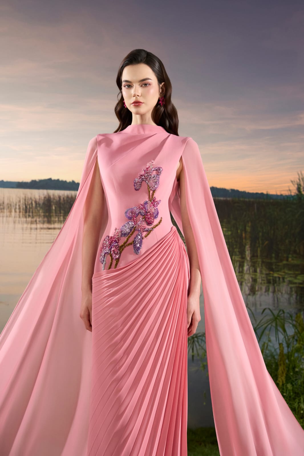 A powder pink evening gown includes draping that flows into a chiffon cape, accentuated by floral jewelry appliques on the bodice.