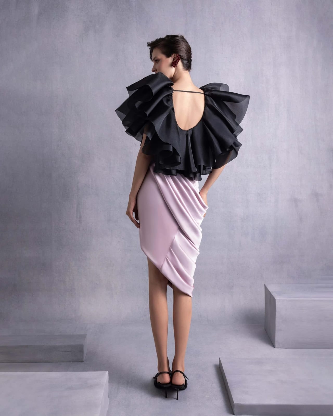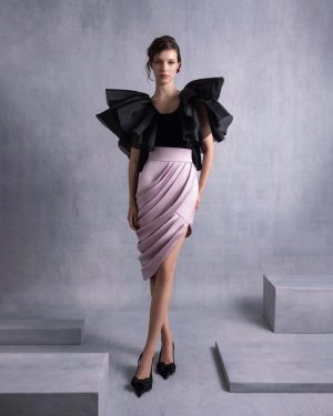 An exquisite old rose satin high-low skirt with intricate draping that contours the figure beautifully. The asymmetrical hemline and high slit add a contemporary edge, making it a perfect choice for chic and sophisticated occasions.