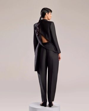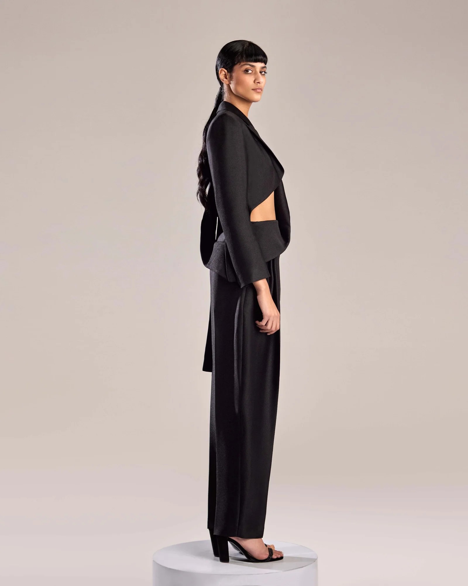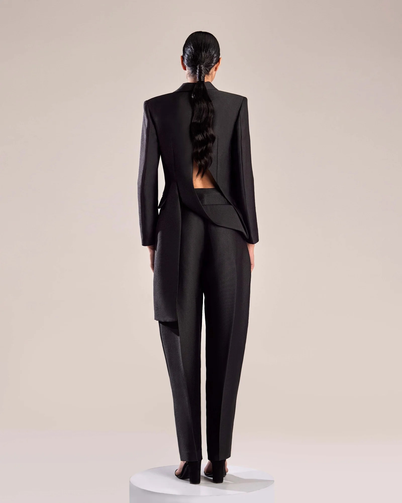 This Black Mikado Piqué jacket features an asymmetrical open front design and structured shoulders for a modern, sleek look. The tailored fit and innovative cut-out back add a unique twist to the classic blazer style. Crafted from luxurious Mikado Piqué, this jacket offers a sophisticated and contemporary edge. Best paired with matching pants for a complete ensemble.