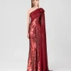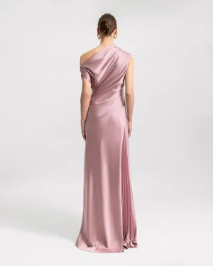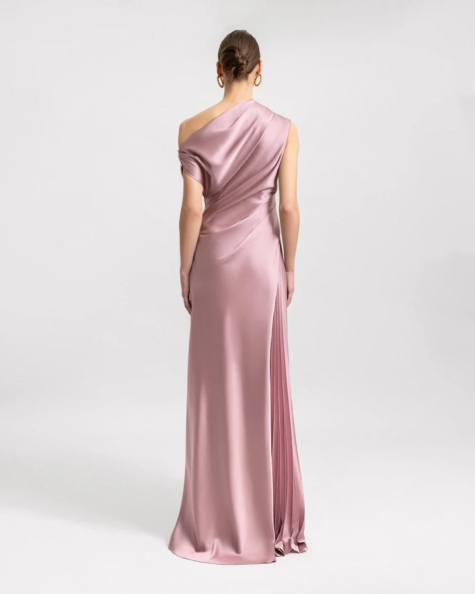 Draped long dress, featuring asymmetrical satin plissé under-skirt.