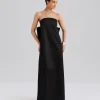 Asymmetrical draped satin dress with a slit on the side and a sequined skirt.