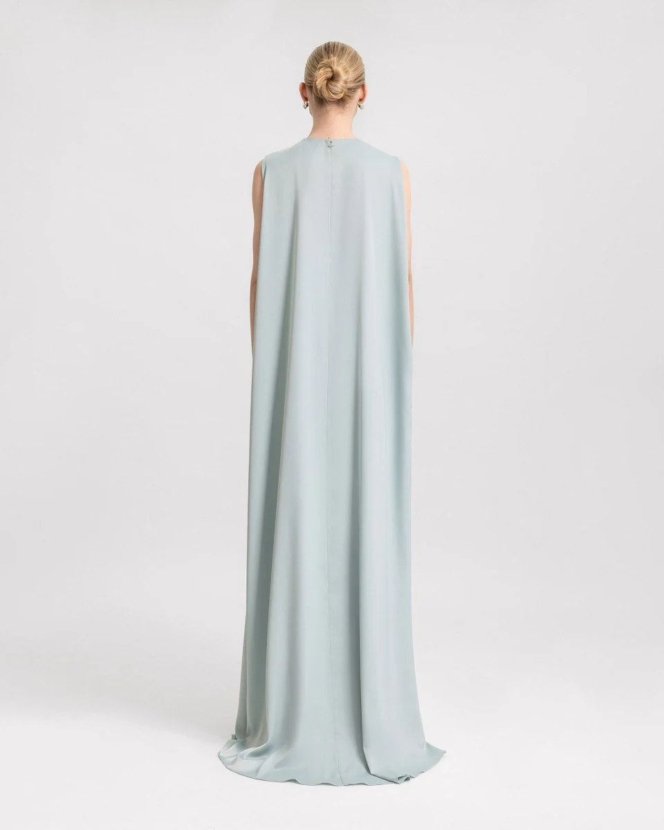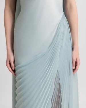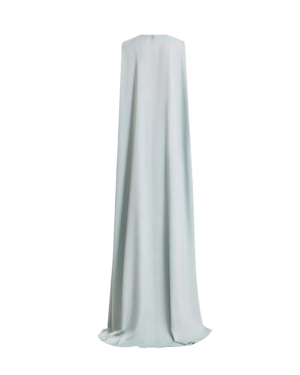 Slim-cut draped dress with an asymmetrical sheer overskirt, a slit on the side and a cape.