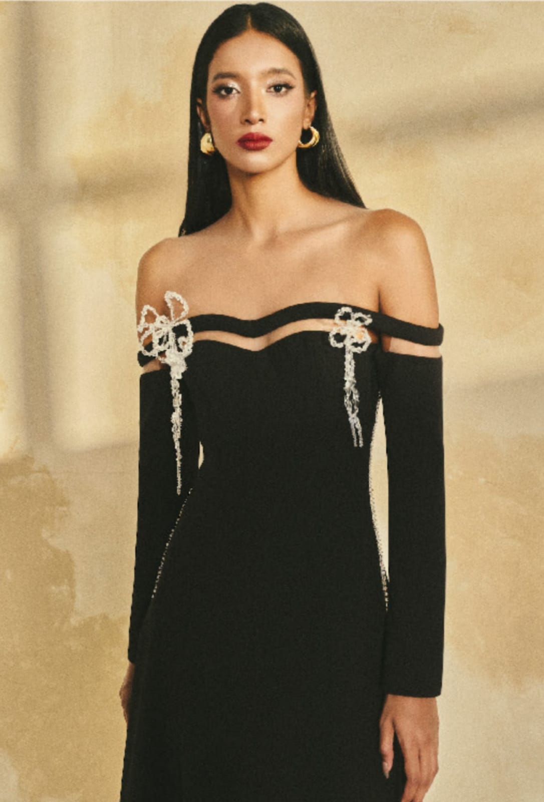 Off shoulder, Long sleeve midi dress from poly crepe, featuring a softly contoured neckline.