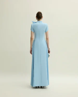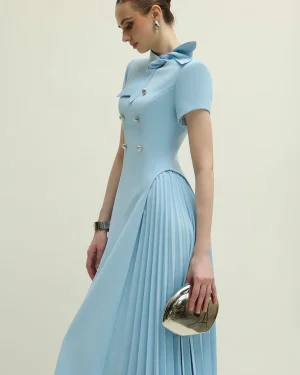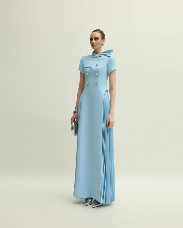 Light blue maxi dress with a high neckline, short sleeves, doubled-breasted gold tone buttons on the bodice and a pleated skirt.