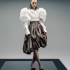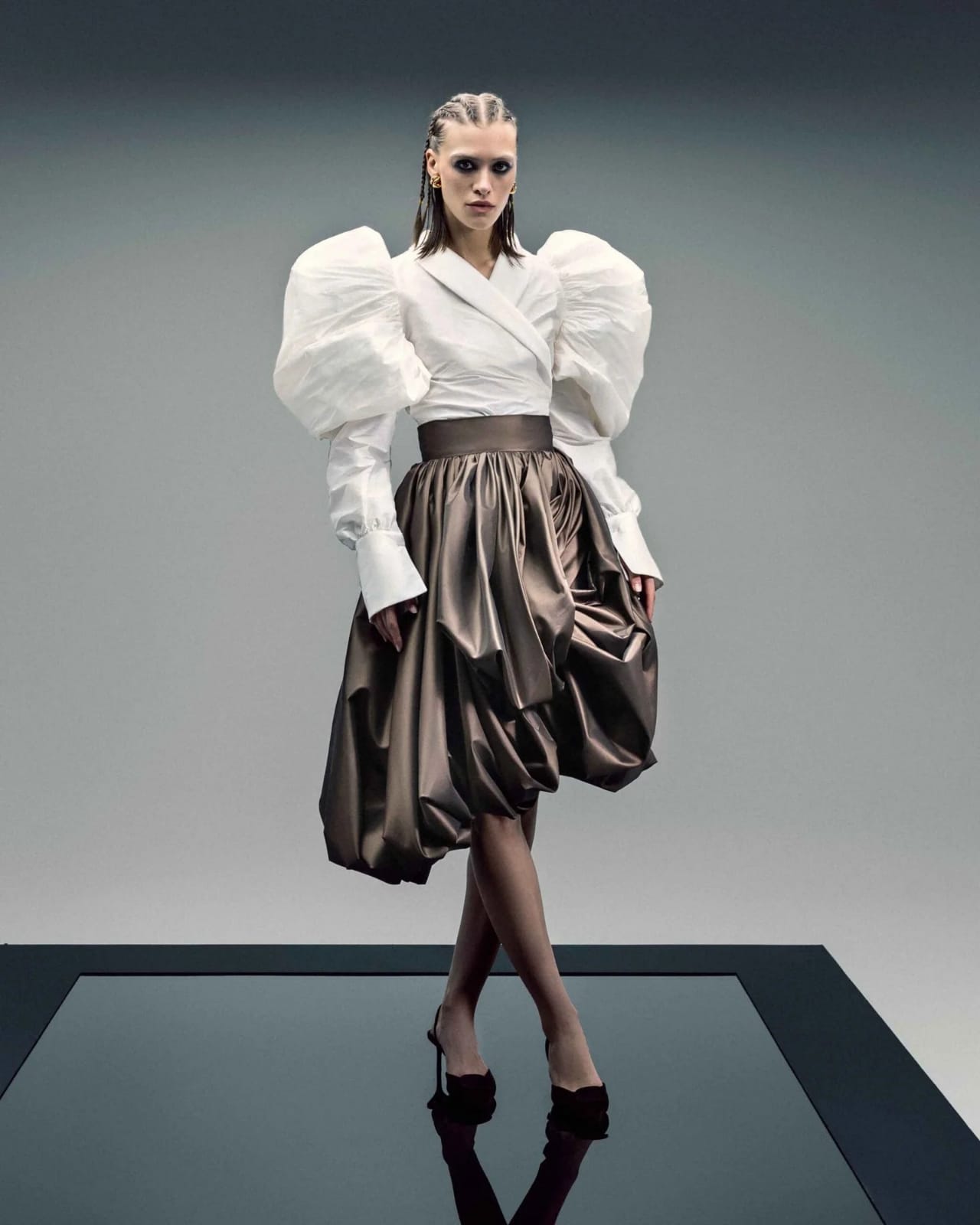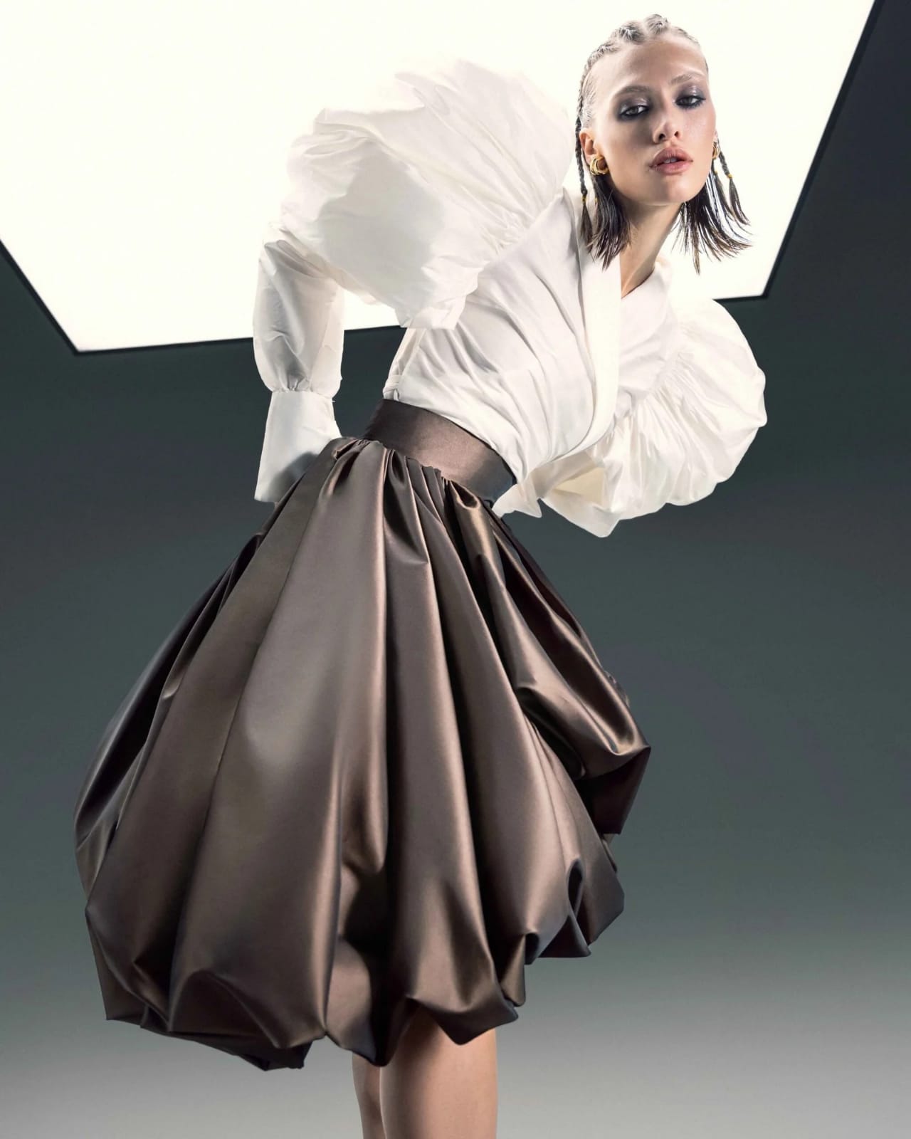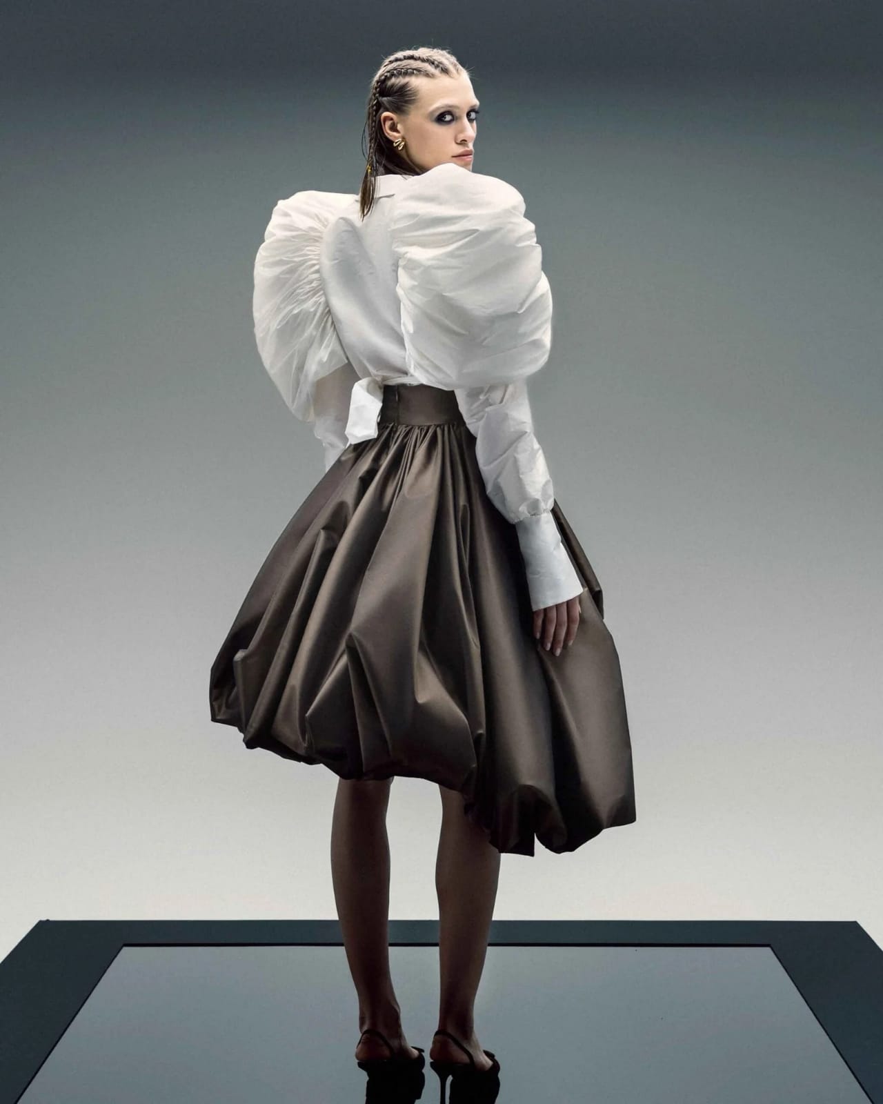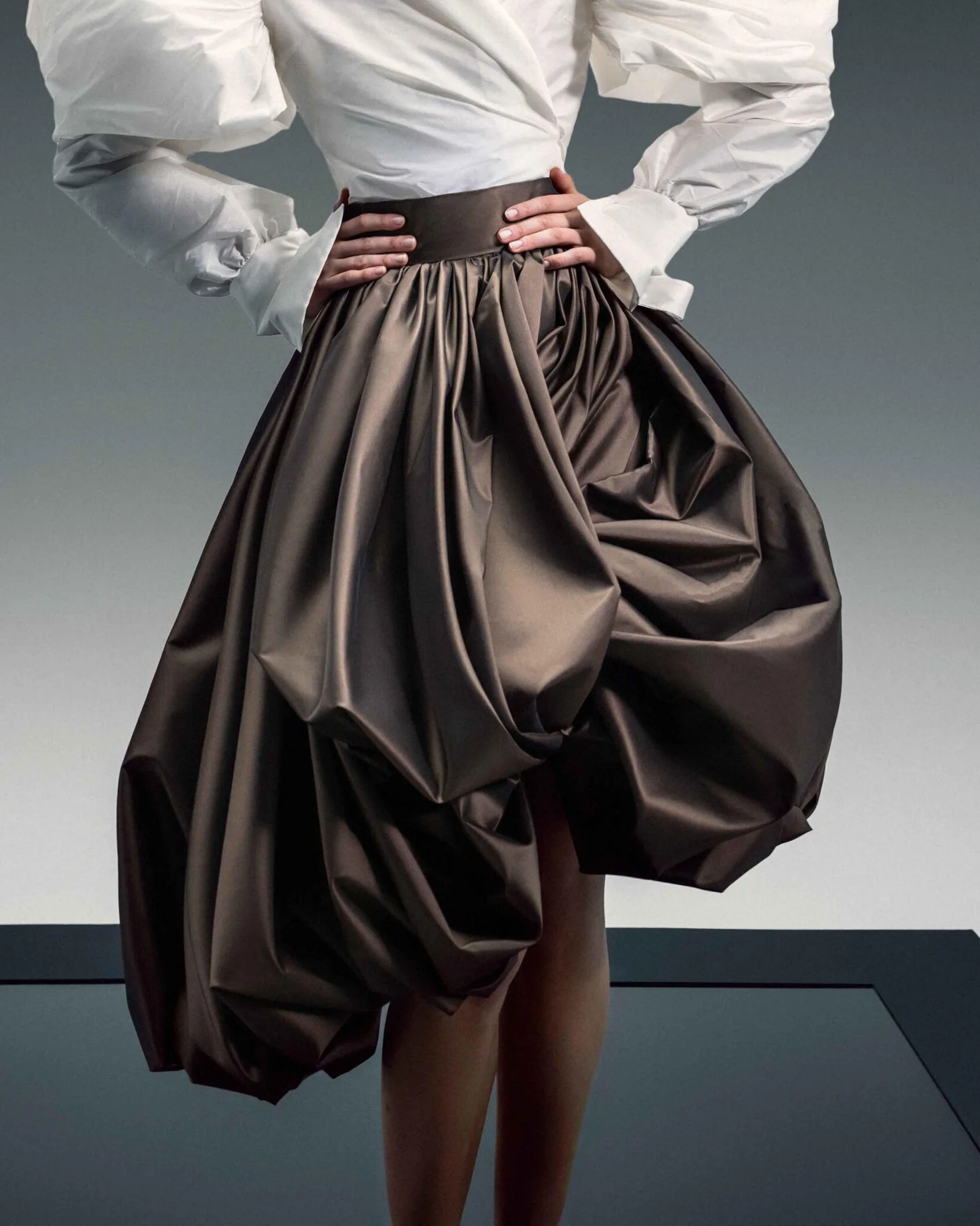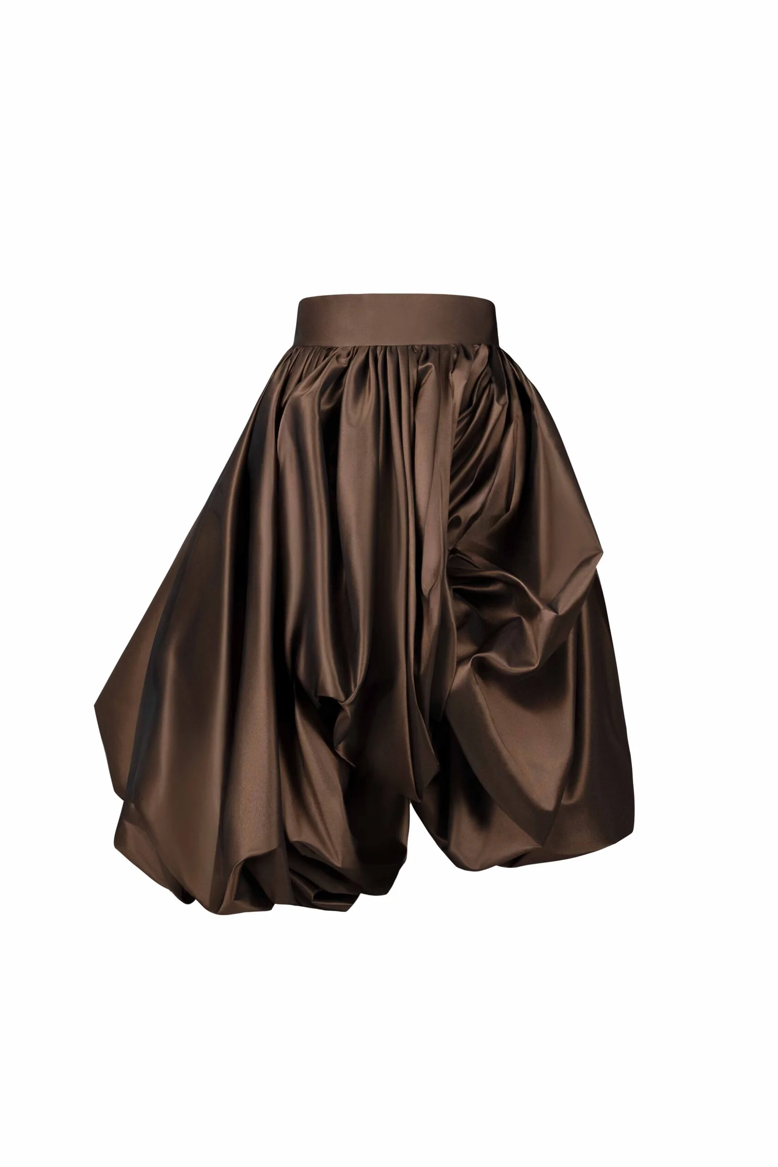 Achieve a striking silhouette with this distinctive brown taffeta midi skirt. Its innovative design creates a voluminous, balloon-like shape, adding an architectural element to your ensemble. Crafted from rich taffeta, this skirt offers a luxurious drape and elegant sheen, ideal for making a sophisticated statement.