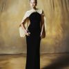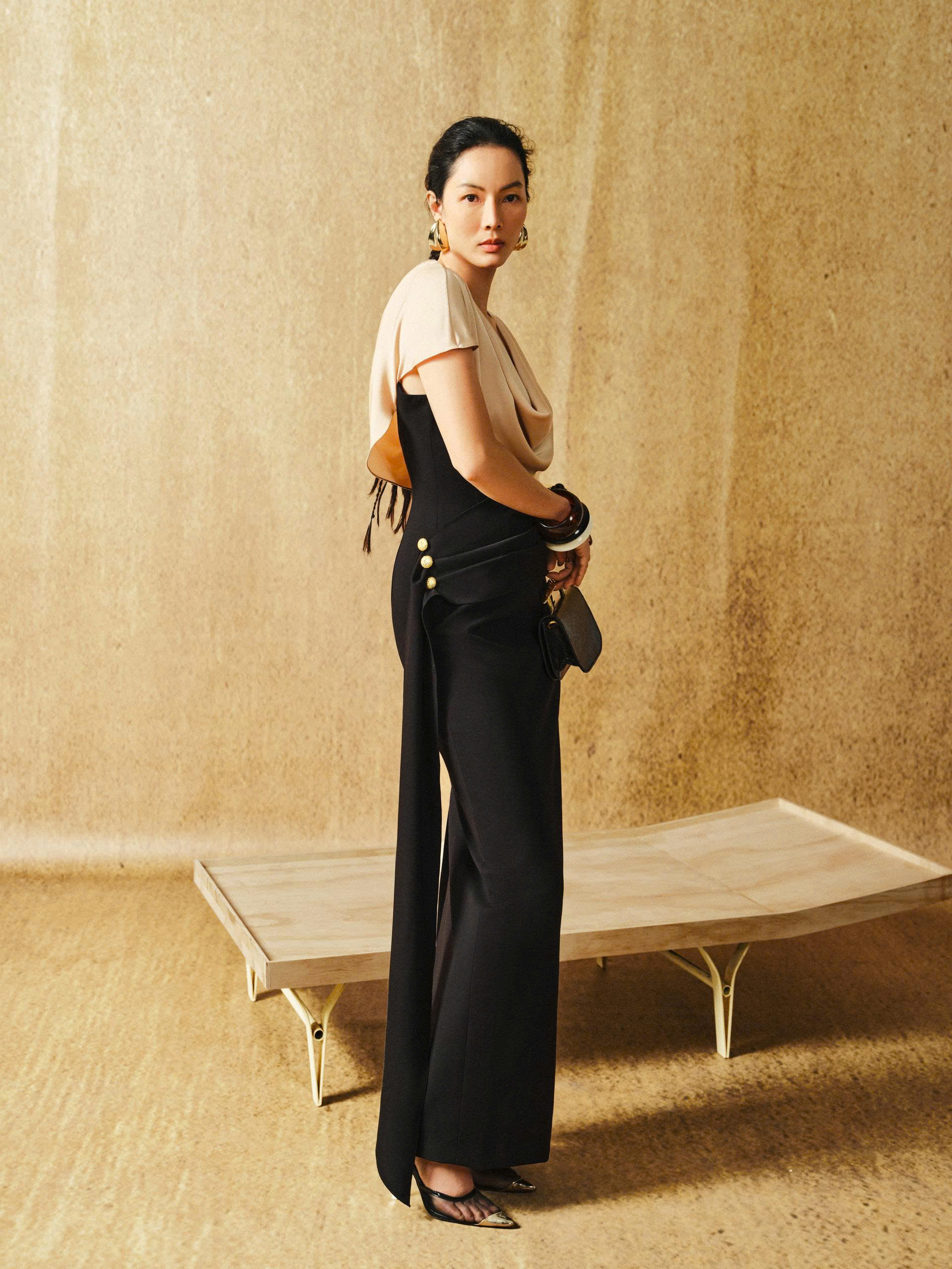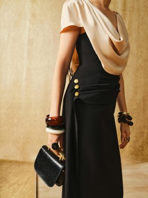 Offers structure and elegance. Featuring a cowl neckline, draped waist, and crystal-button details, it creates a refined silhouette suitable for day and evening occasions.