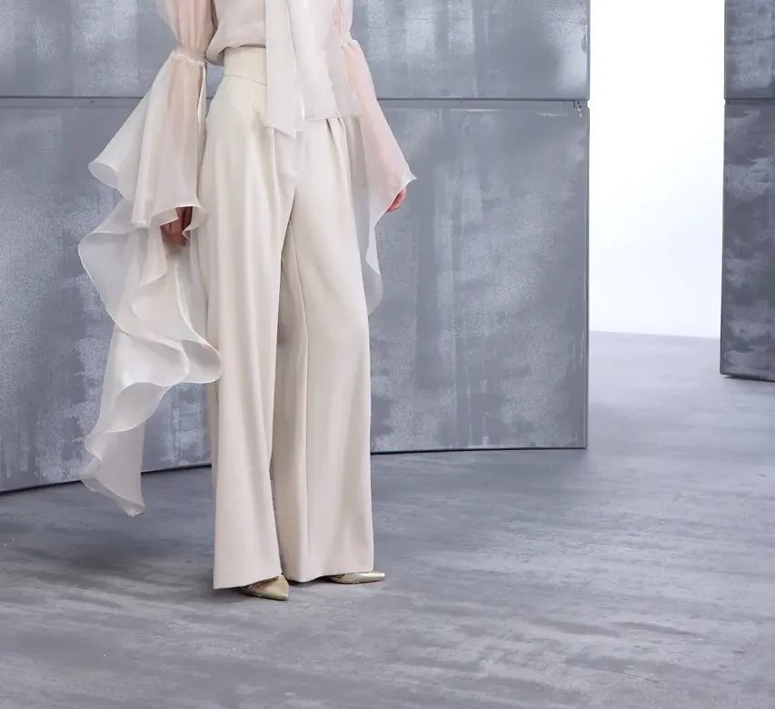 Elegant high-waisted,, wide-leg trousers paired with any elegant top.