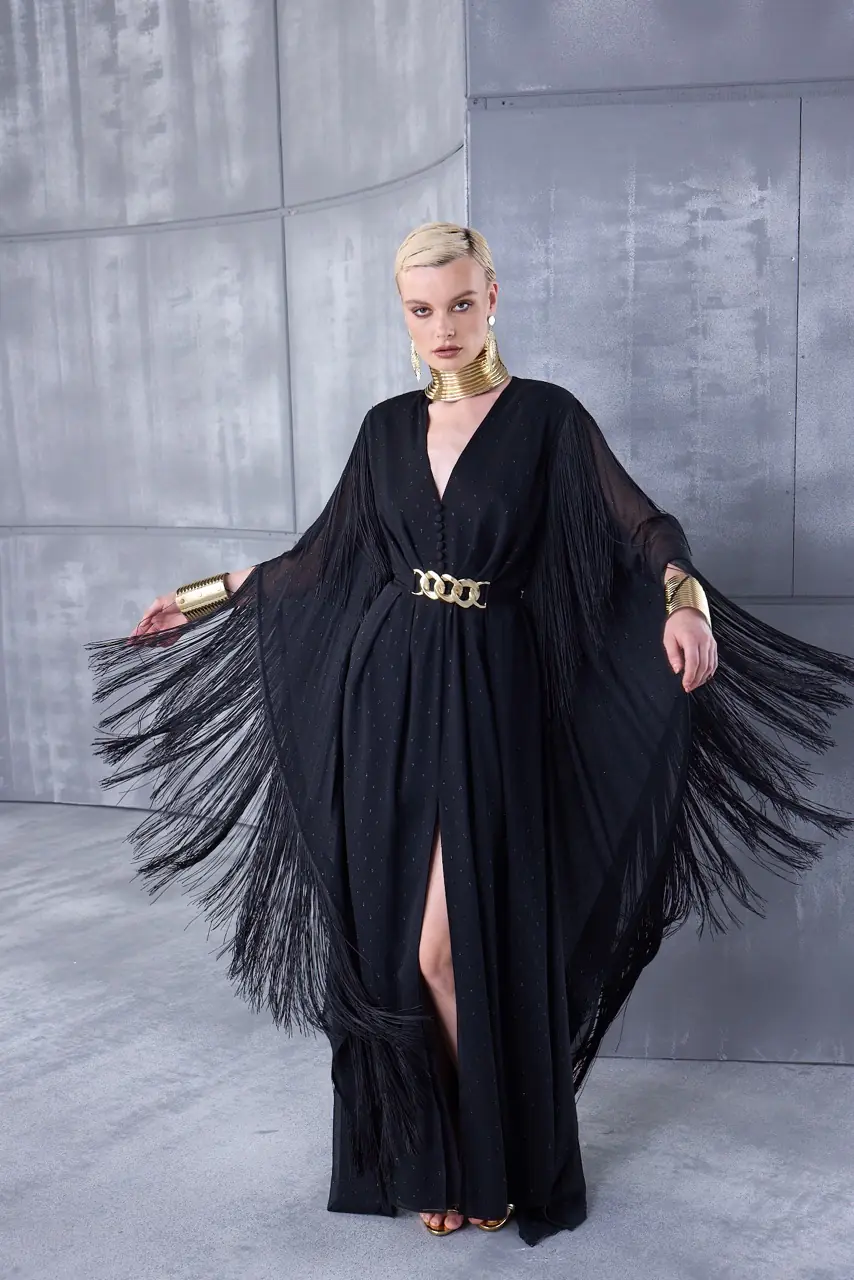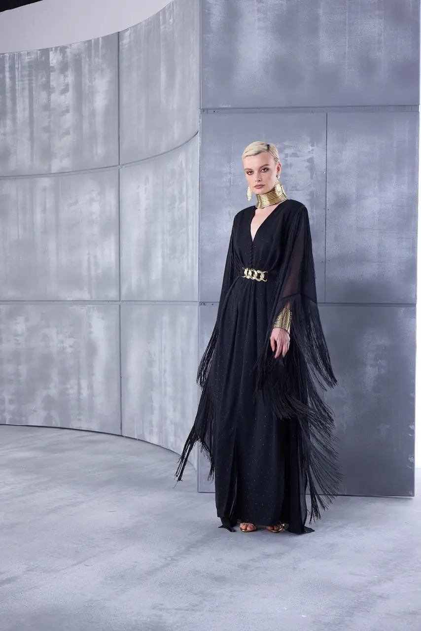 Chain Belted Chiffon Dress with Glitter Details.
