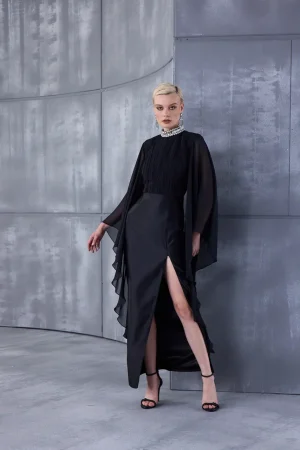 A black chiffon cape, featuring a draped bodice and cape-inspired sleeves.
