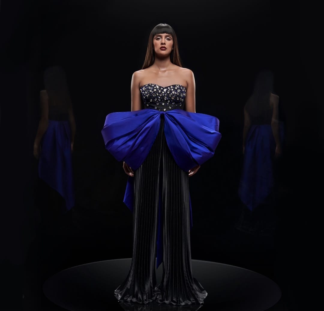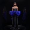 Black jumpsuit with red bow pleated.