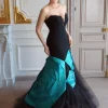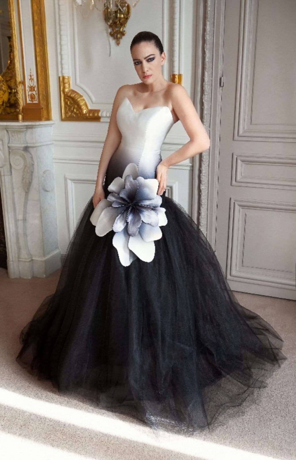 Black and White strapless gown featuring a large, sculptural floral embellishments and a tulle skirt.