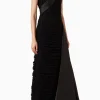 A high-necklace gown with layered soft tulle and sculpted florals.