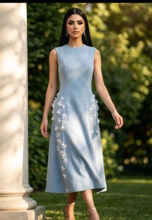 Wearing a light blue, sleeveless midi dress adorned with white floral embellishments along the sides.