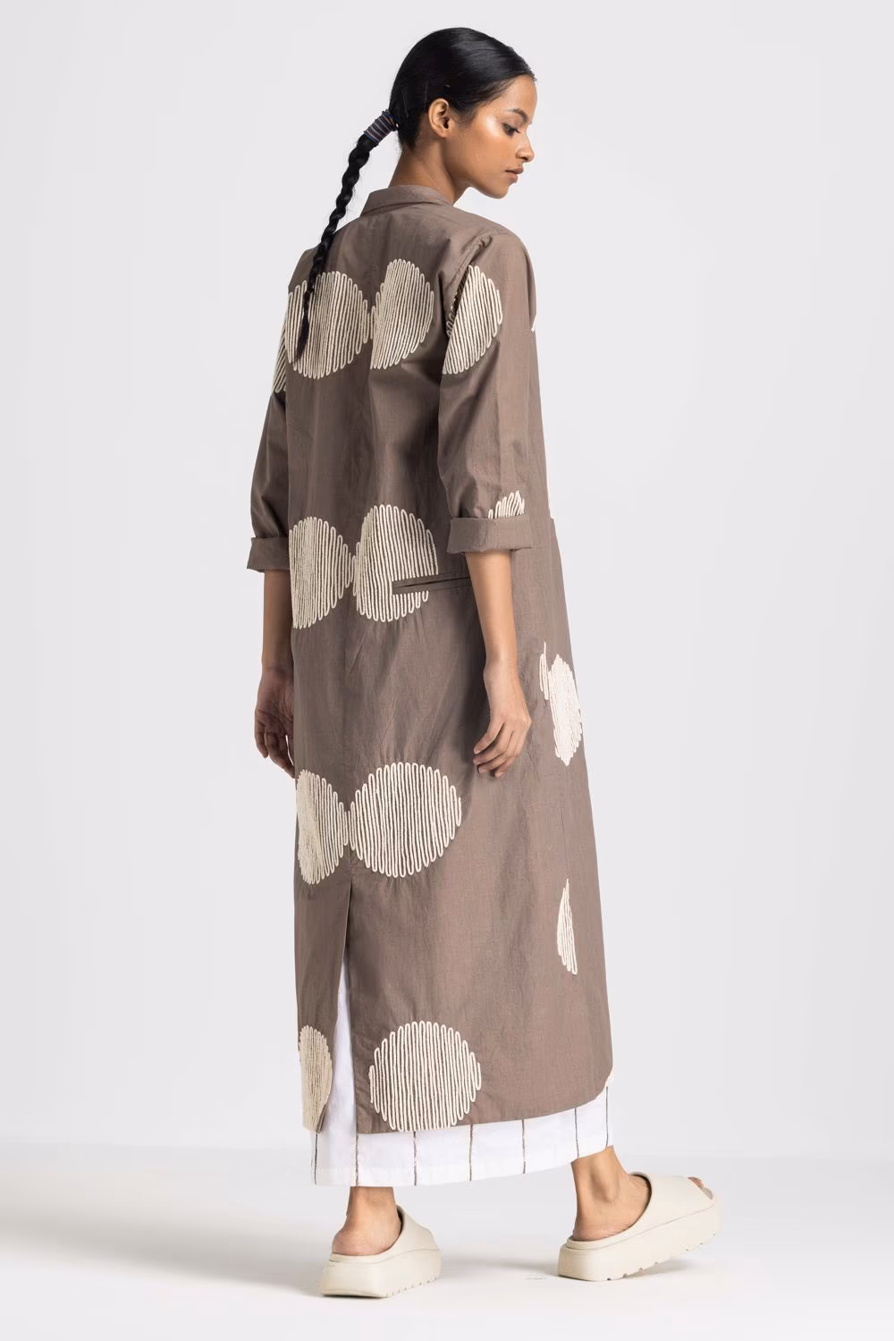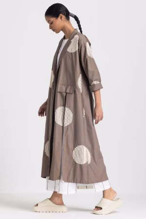 The Jacket features a circular wave embroidery detail and front slit with flap pockets.