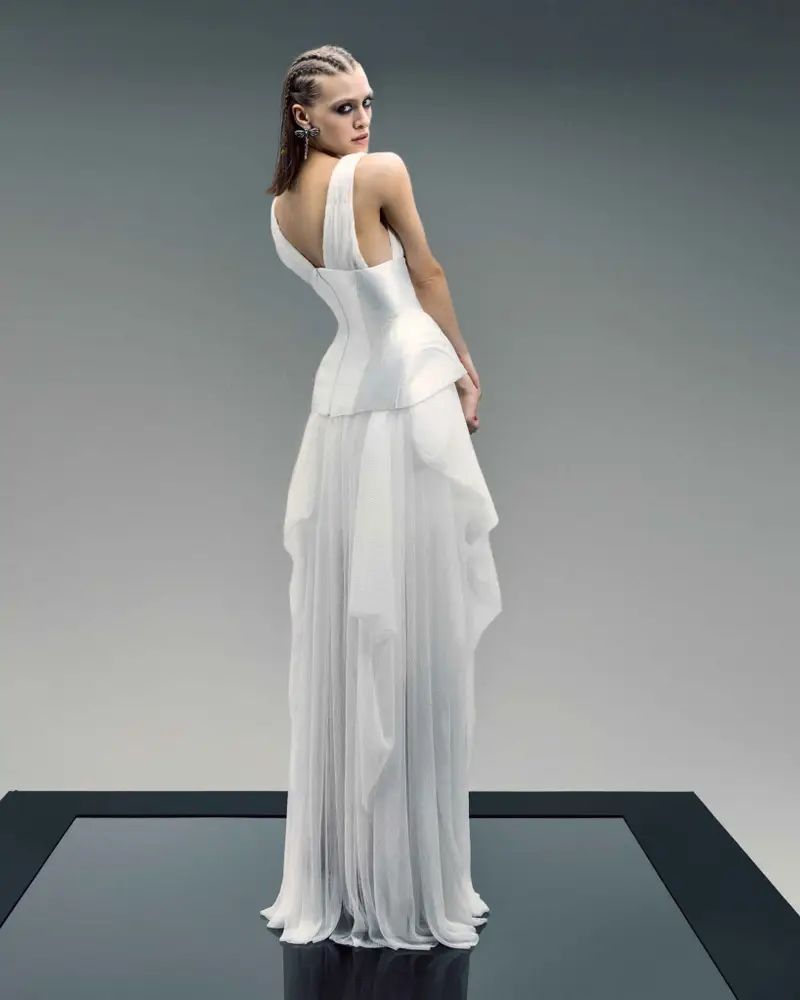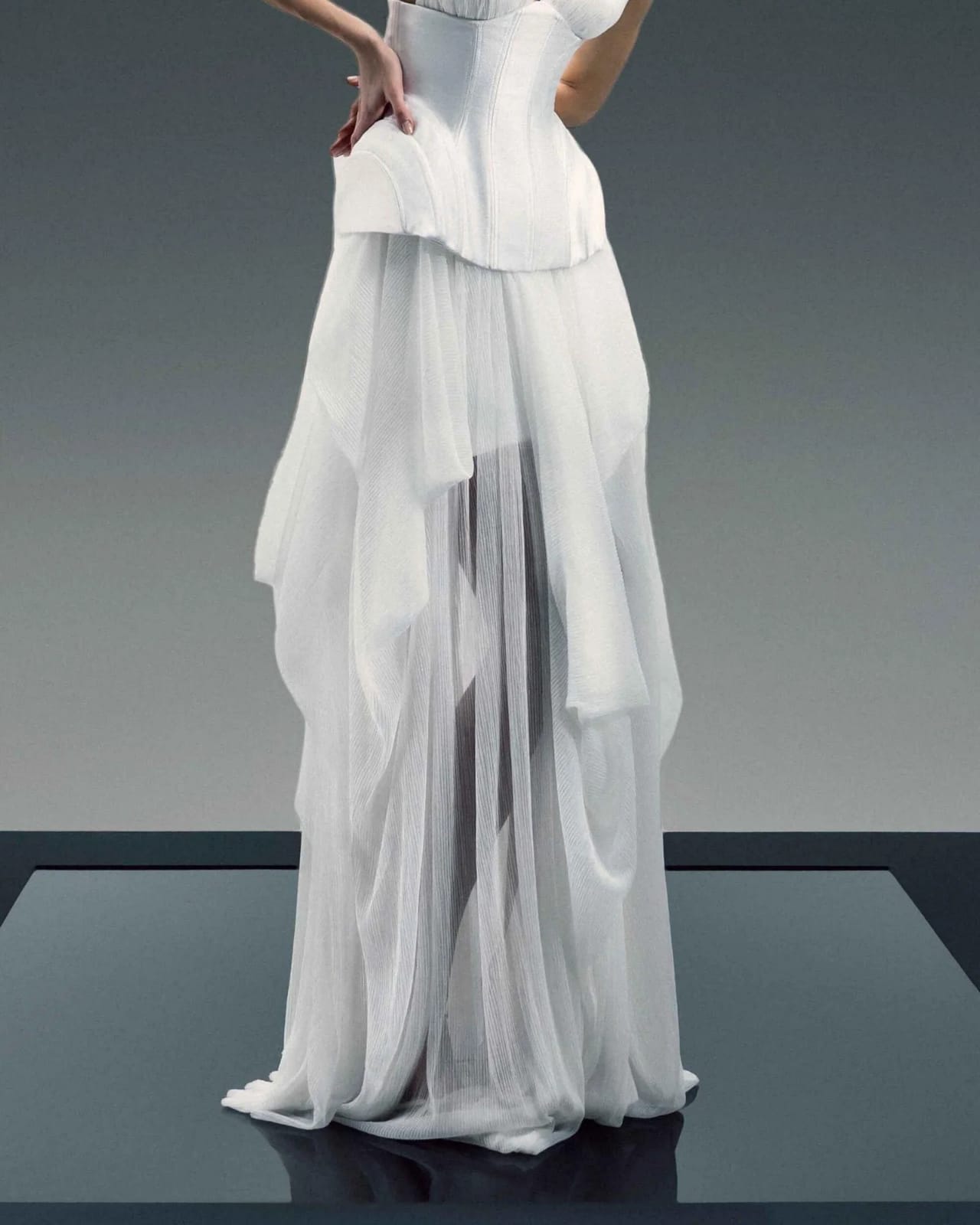 Designed for movement and layered depth, this off-white mini skirt is crafted in Mikado piqué and topped with a flowing pleated chiffon overskirt. The mini base provides structure and a clean shape, while the chiffon overlay cascades in airy volumes, creating a sense of fluidity with each step.