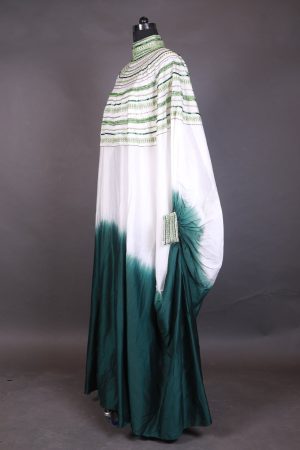 Cotton silk kaftan in ombre of white and green with a high neckline, surfaced with intricate embroidery.