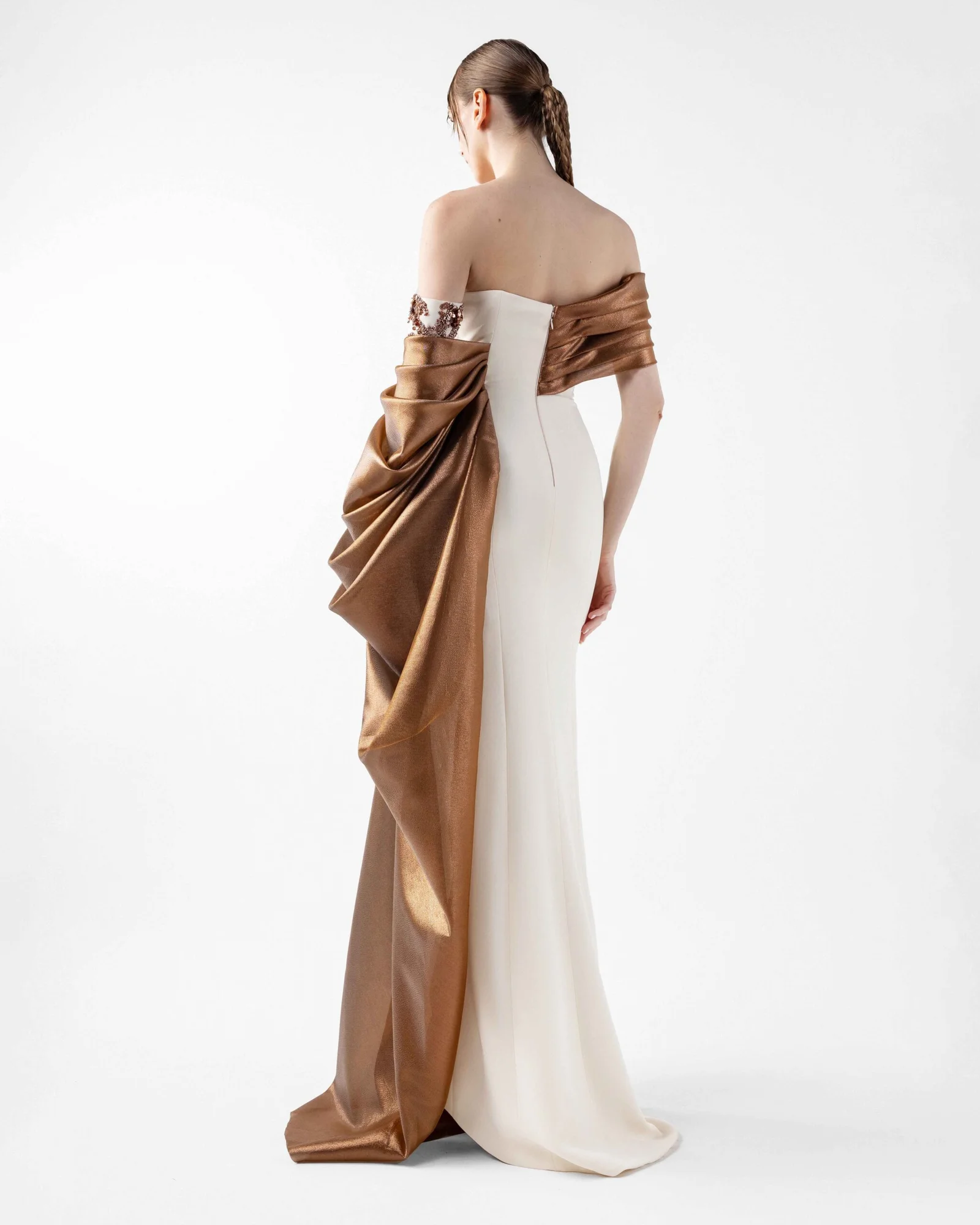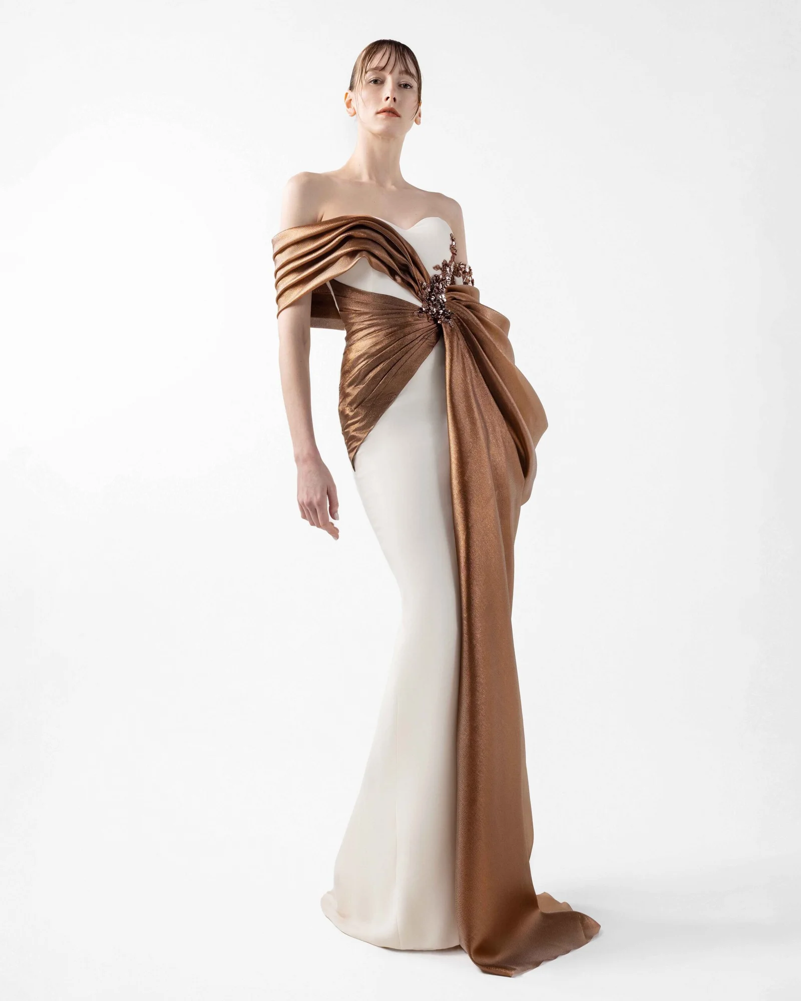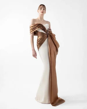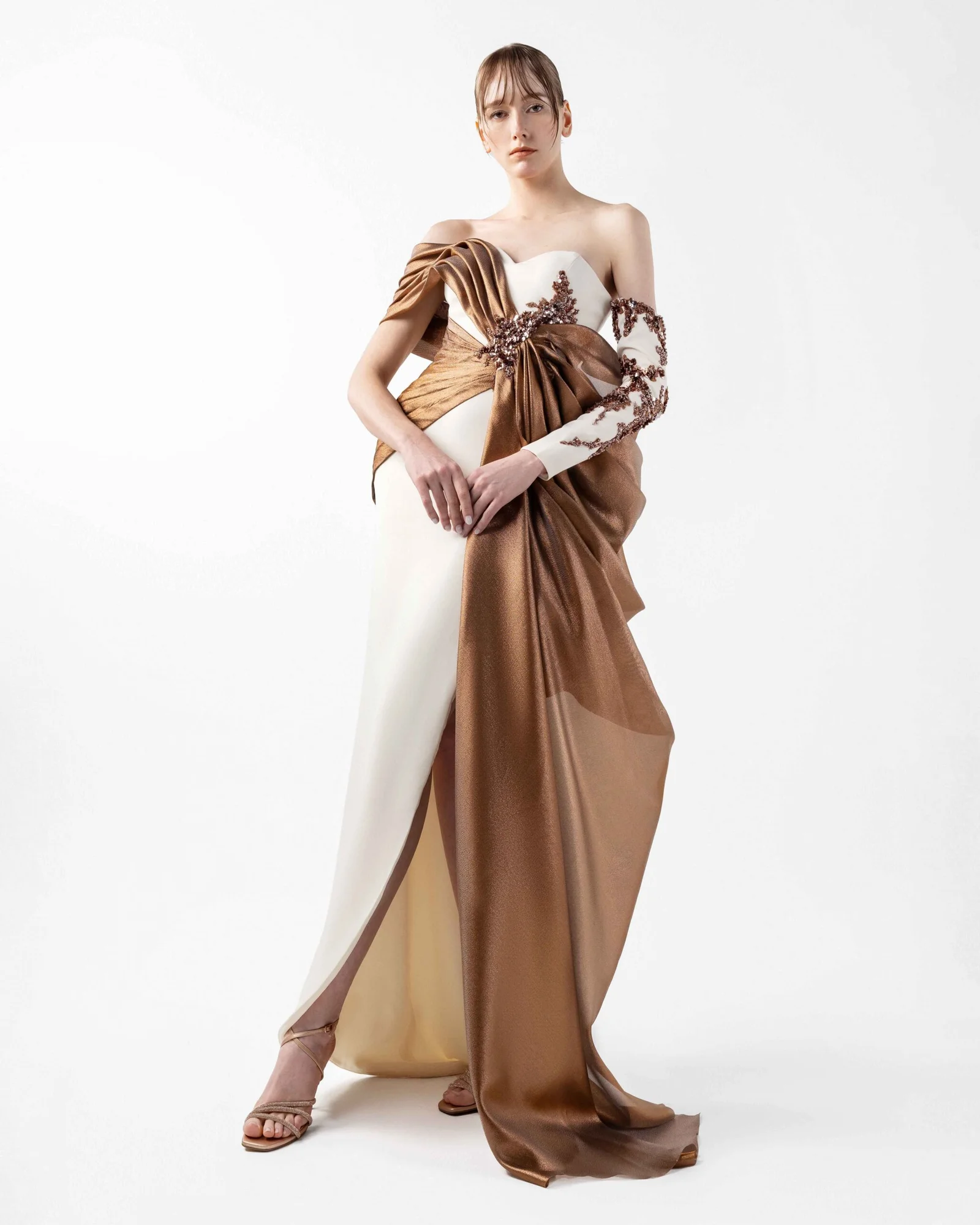 Stun in this exquisite cream crepe gown, expertly tailored to flatter with its sleek, body-skimming silhouette and alluring high side slit. The dress features an off-the-shoulder design in shimmering lame organza in a rich brown hue, which elegantly drapes across the bust and cinched waist, transforming into a luxurious train. Intricate embroidery adorns both the bustline and the single long sleeve, adding a touch of opulent sparkle. This versatile gown is perfect for making an unforgettable statement at any red-carpet event, gala, or sophisticated evening affair.