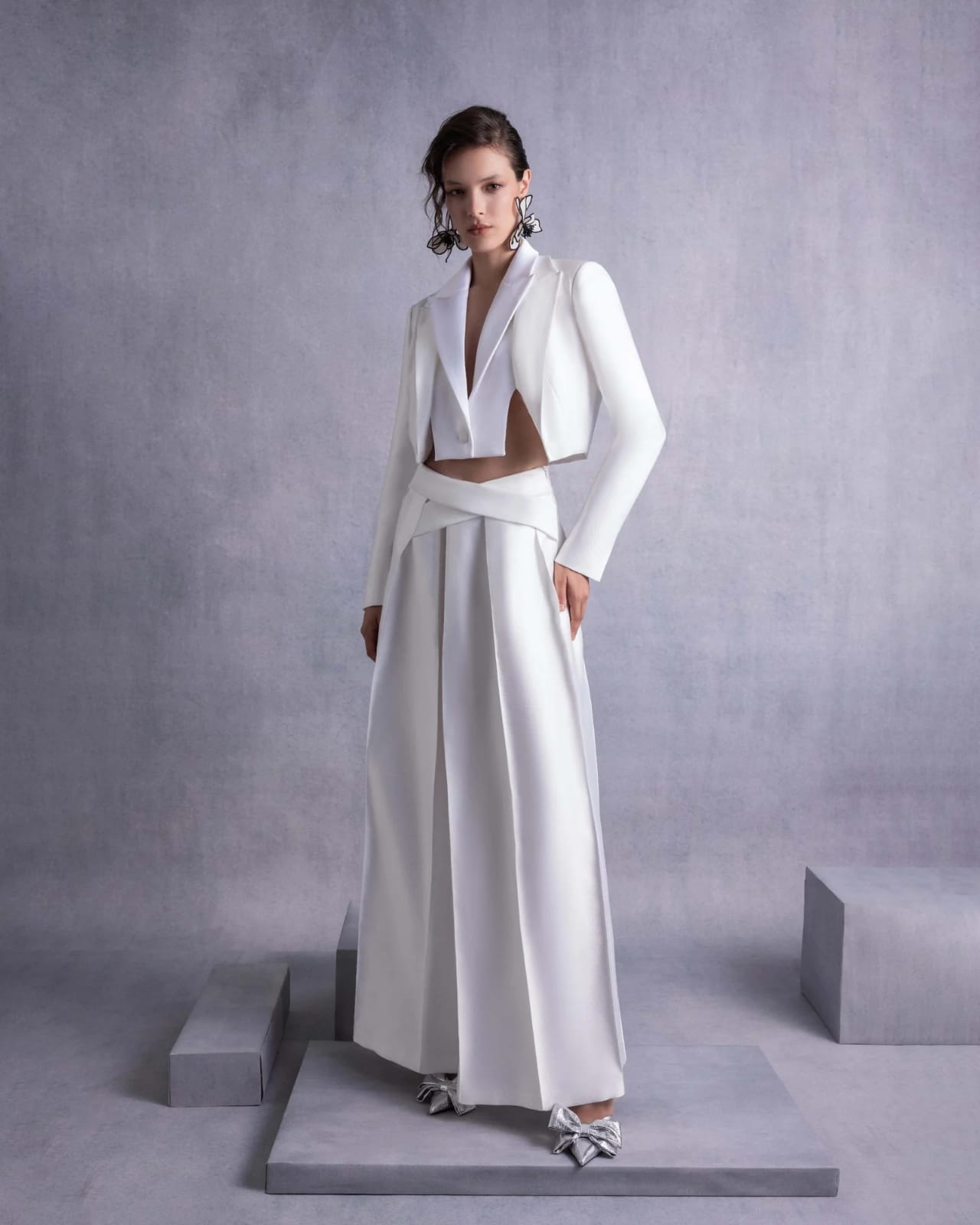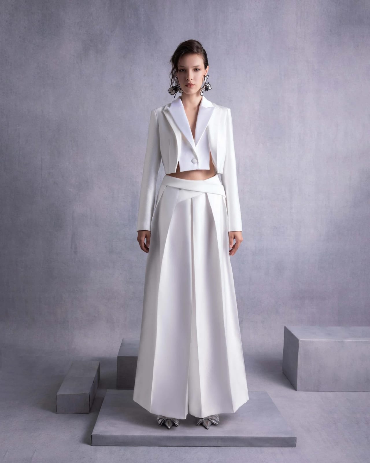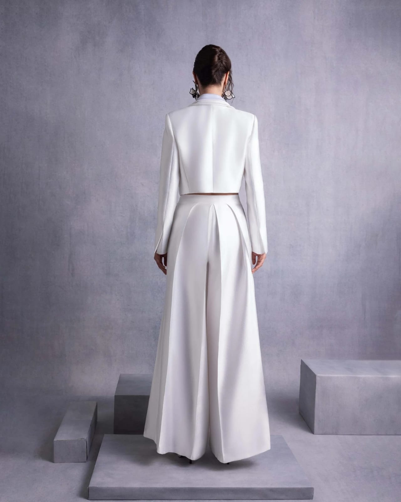 A cropped piqué and razmir jacket designed for versatility and refinement. The tailored lapels and structured cut enhance the modern silhouette, while the luxurious blend of piqué and razmir fabrics adds a polished touch. Perfect for pairing with high-waisted trousers or skirts.