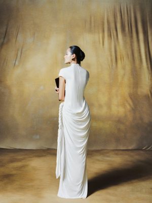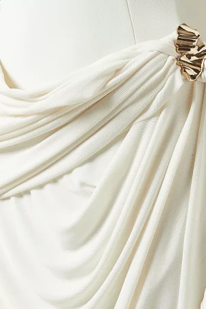 Features draping at the waist. The soft fabric ensures comfort throughout the evening. A refined choice for special occasions.