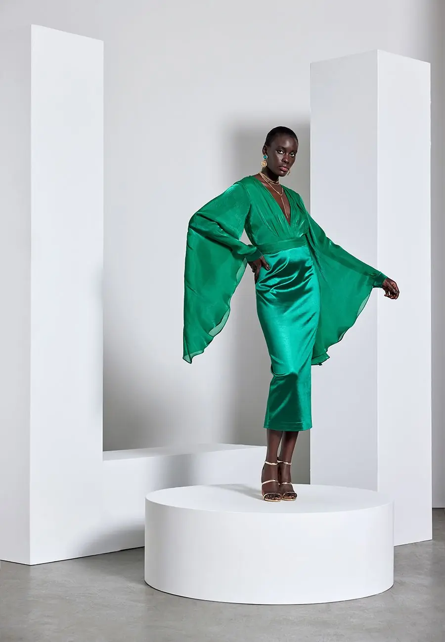 V-neck pleated with draped sleeves.