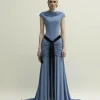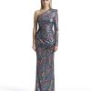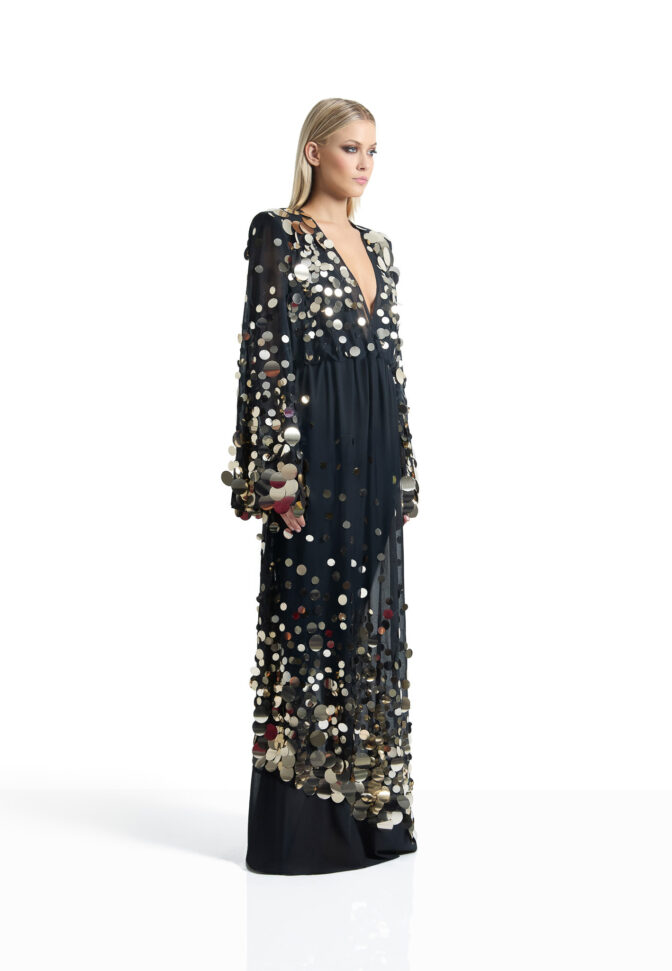 A FULL LENGTH, PARTIALLY LINED MESH SEQUIN DRESS WITH BELL SLEEVES, ELASTIC WAIST AND SHOULDER ACCENTS.