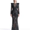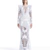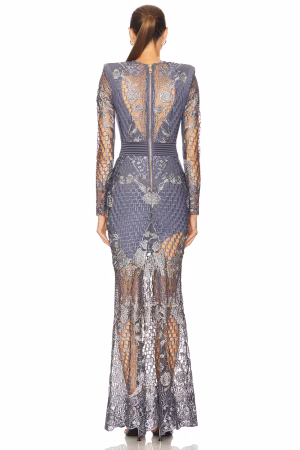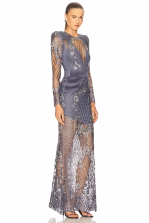 A partially lined honeycomb lace gown with stitched satin paneling and shoulder