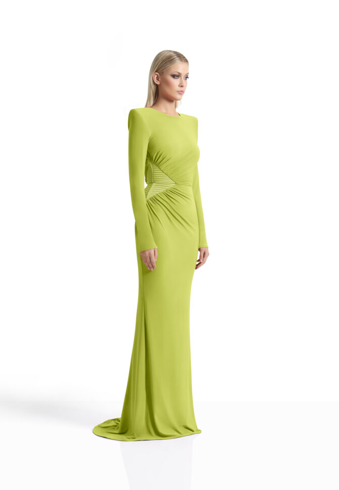 A LONG SLEEVE STRETCH JERSEY GOWN WITH STITCHED SATIN SIDE PANEL, GATHERED FEATURE AND SHOULDER ACCENTS.