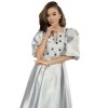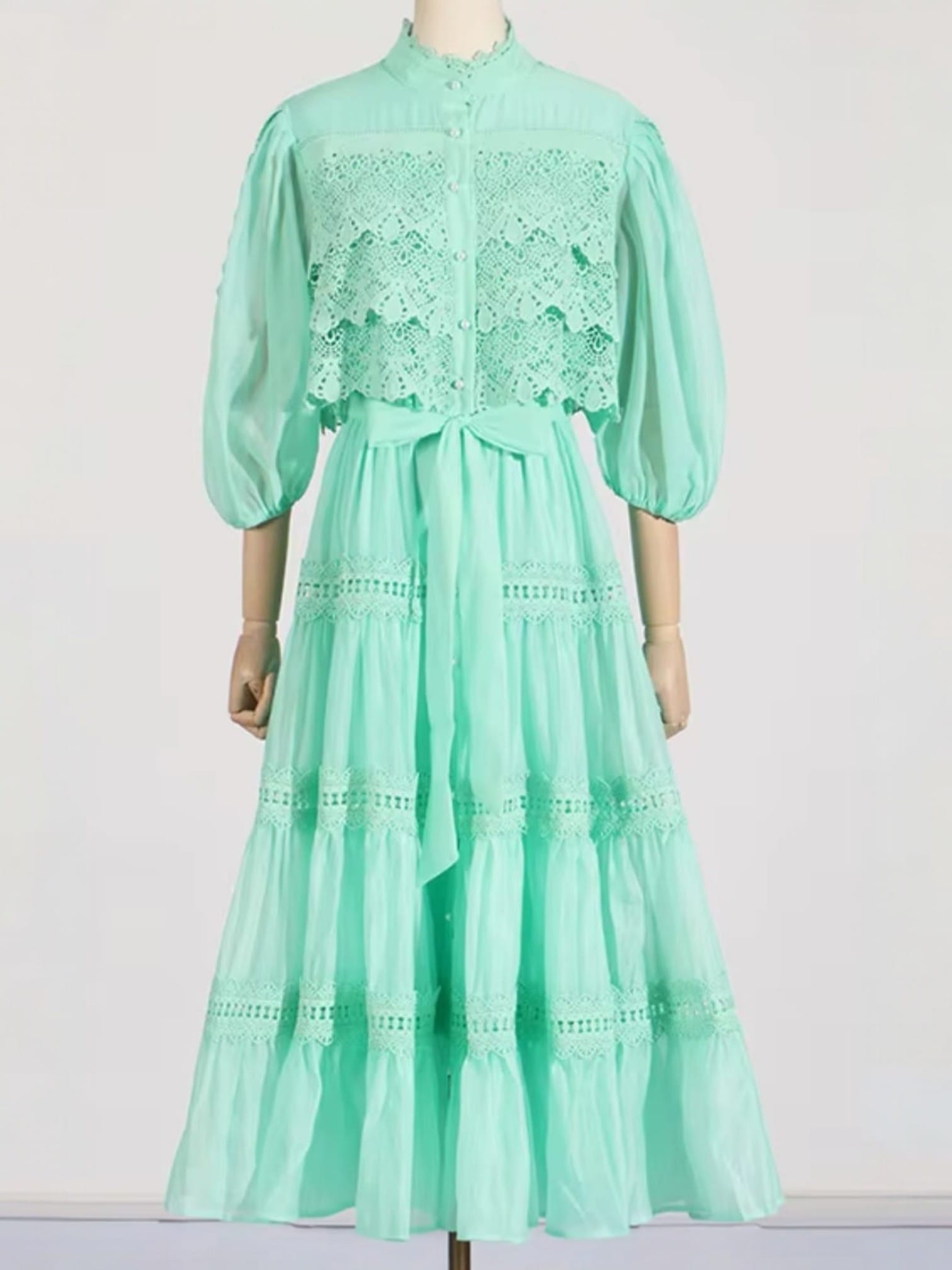 A luxury embroidered midi dress for women, often featuring a stand neck,, pearl button details, and tired ruffles.
