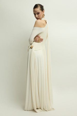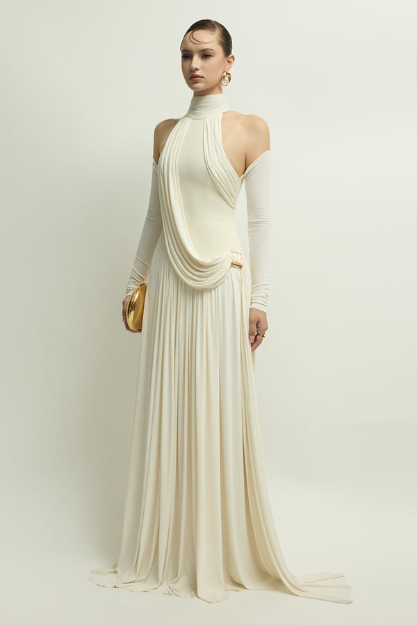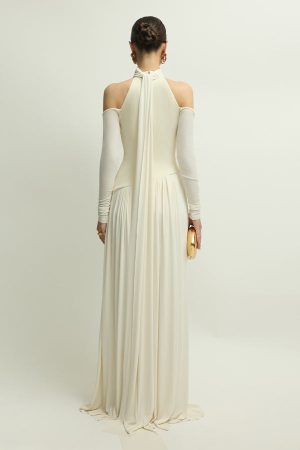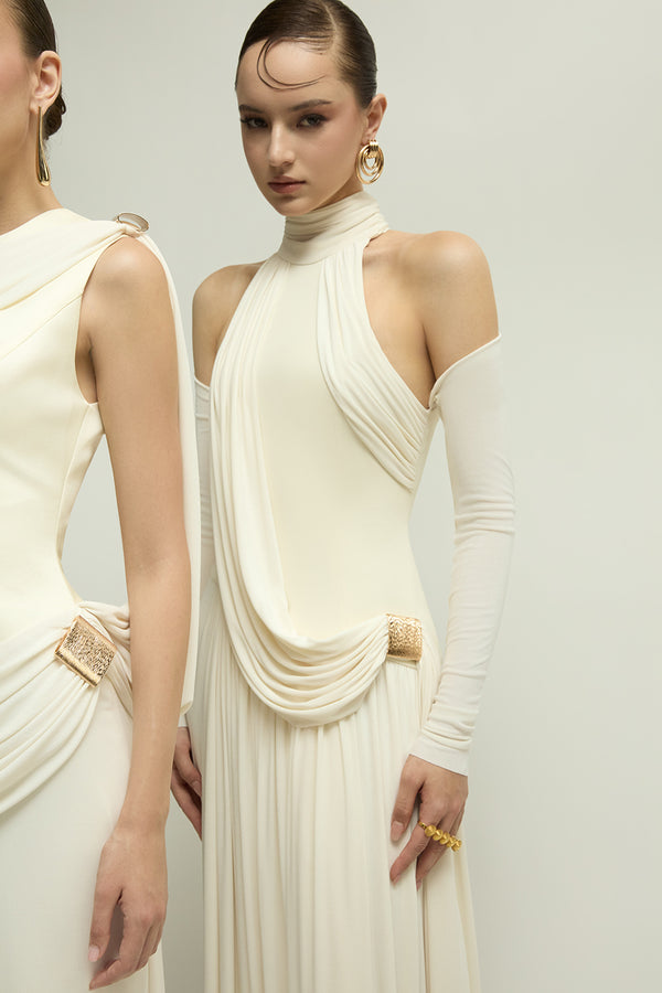 Elevate your style with this expertly crafted sheath maxi dress. Featuring a cotton halter neckline, cold shoulder sleeves, refined draped detailing, and chic metal embellishments, it combines sophistication with a modern edge. Ideal for elegant evening events, upscale gatherings, or formal celebrations.
