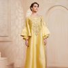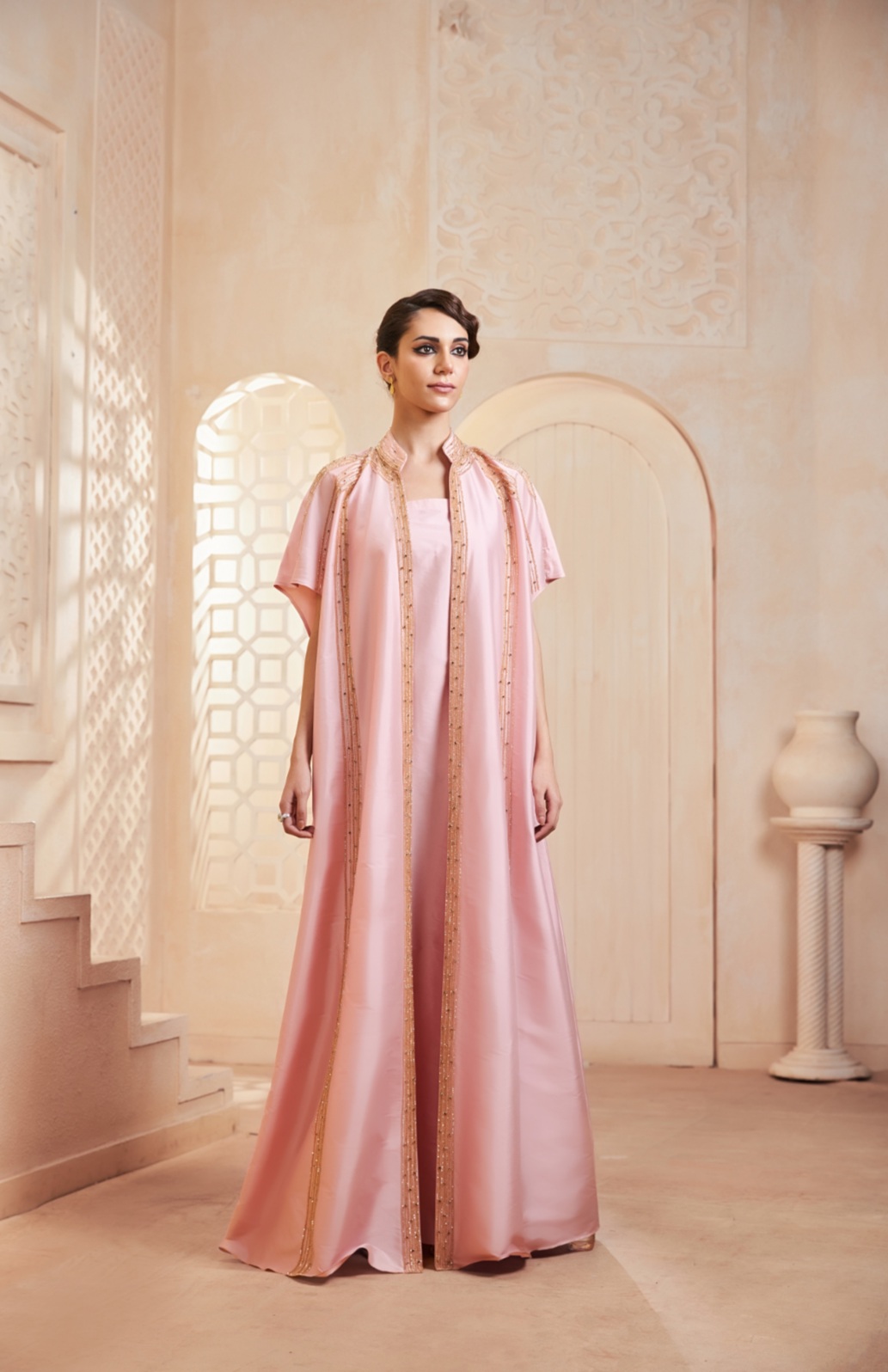 Pink evening gown features a floor-length design with a silky bodice and a matching short-sleeved cape detailed with delicate beaded embellishments along its edges.