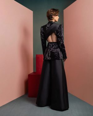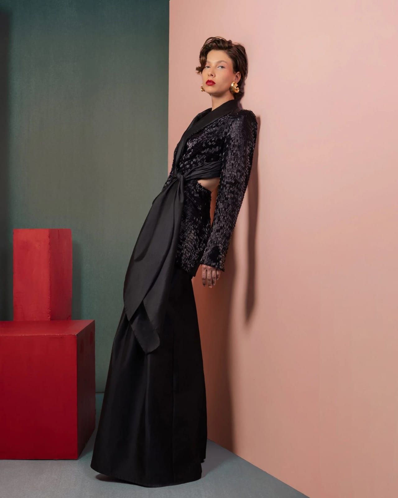 Make a bold statement with our elegant sequin blazer, featuring an all-over shimmer that captivates with every movement. A striking draped taffeta detail enhances the structured silhouette, while the open back adds an unexpected touch of allure. Perfect for evening events, it pairs beautifully with our Pants for a head-turning ensemble.