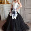 A strapless black gown with a dramatic teal origami-inspired skirt. Fitted bodice flows into a voluminous, ruffled train for striking red-carpet presence.