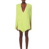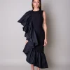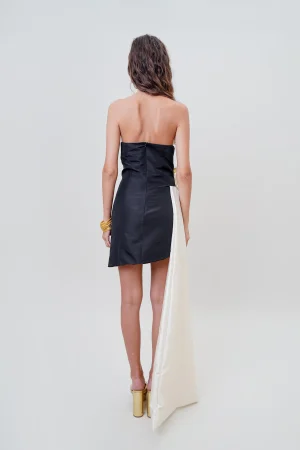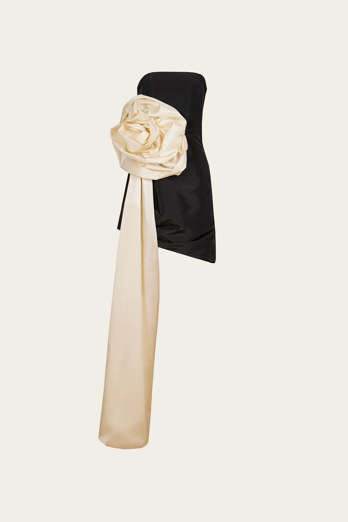 A mini strapless dress with an asymmetric hemline adorned with an oversized rose on the waist.