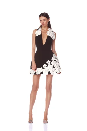 Refined and romantic, the Estelle Mini Dress features a flattering V-neckline and delicate floral appliqué that adds an elevated touch.