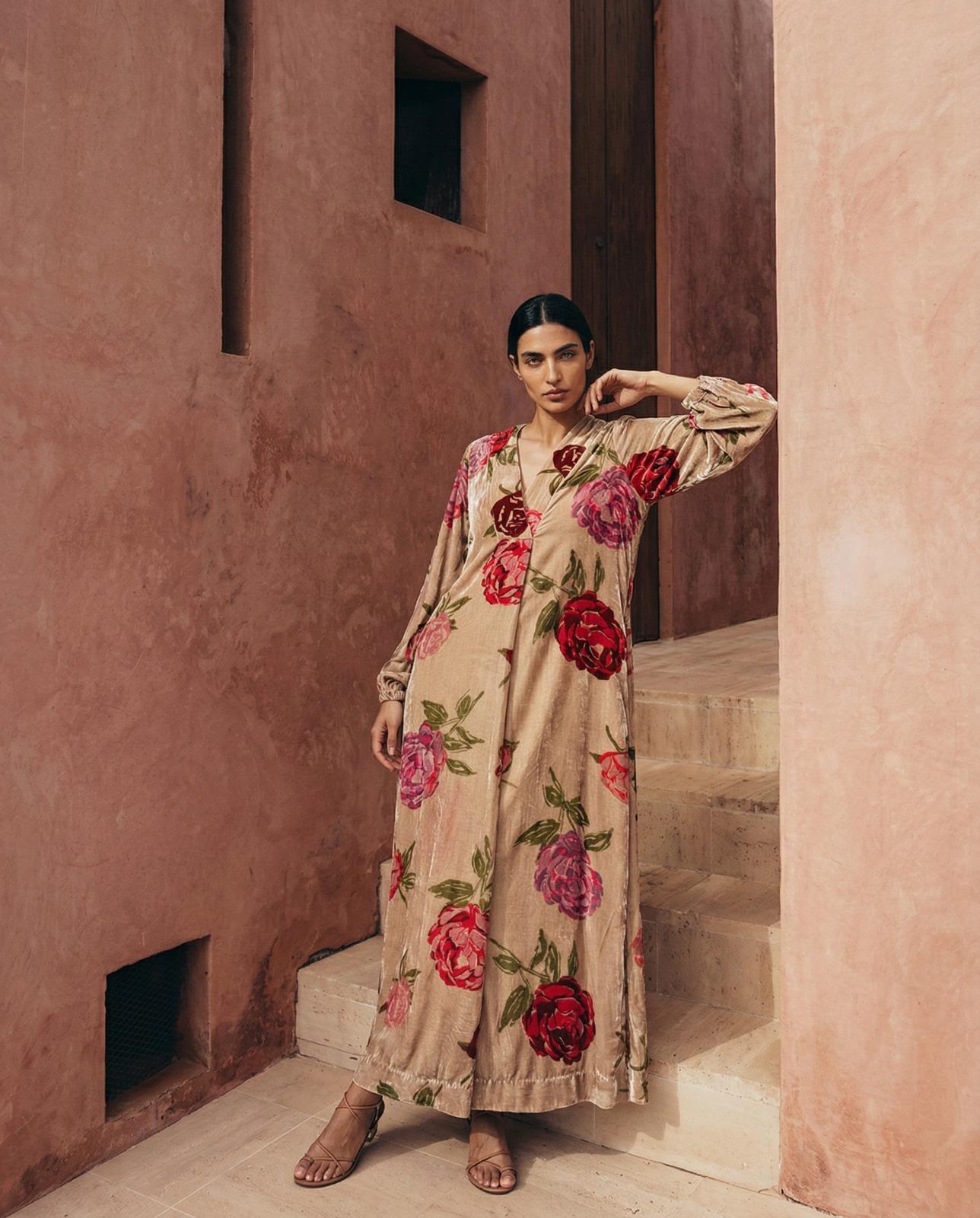 A beige velvet dress featuring a bold floral a long front button closure.