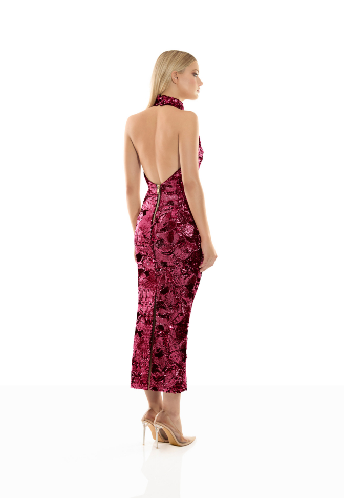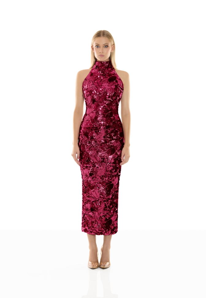 The Florentine Sunset Dress is designed to move with quiet confidence. The halter neckline refines the shoulders and frames the upper body with clean precision, creating a lengthened, sculpted line through the silhouette.