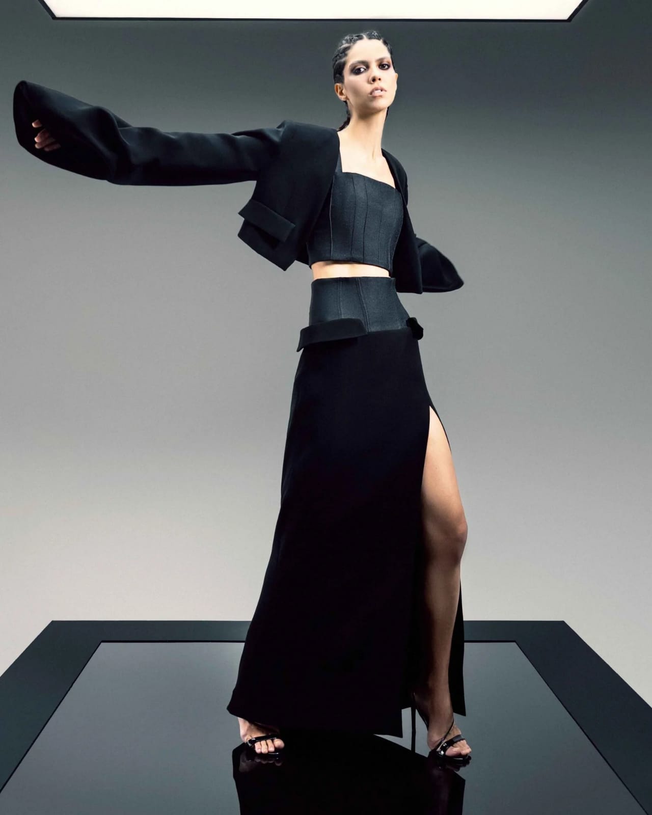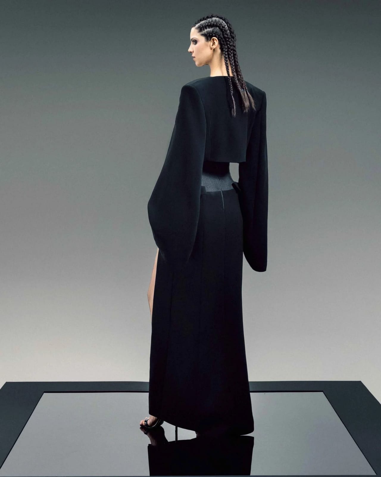 Add avant-garde flair to any ensemble with this black crepe cropped jacket. Its architectural design boasts striking wide sleeves and sharp lines. Perfect for layering over corsets or dresses, jacket ensures a contemporary and bold look.