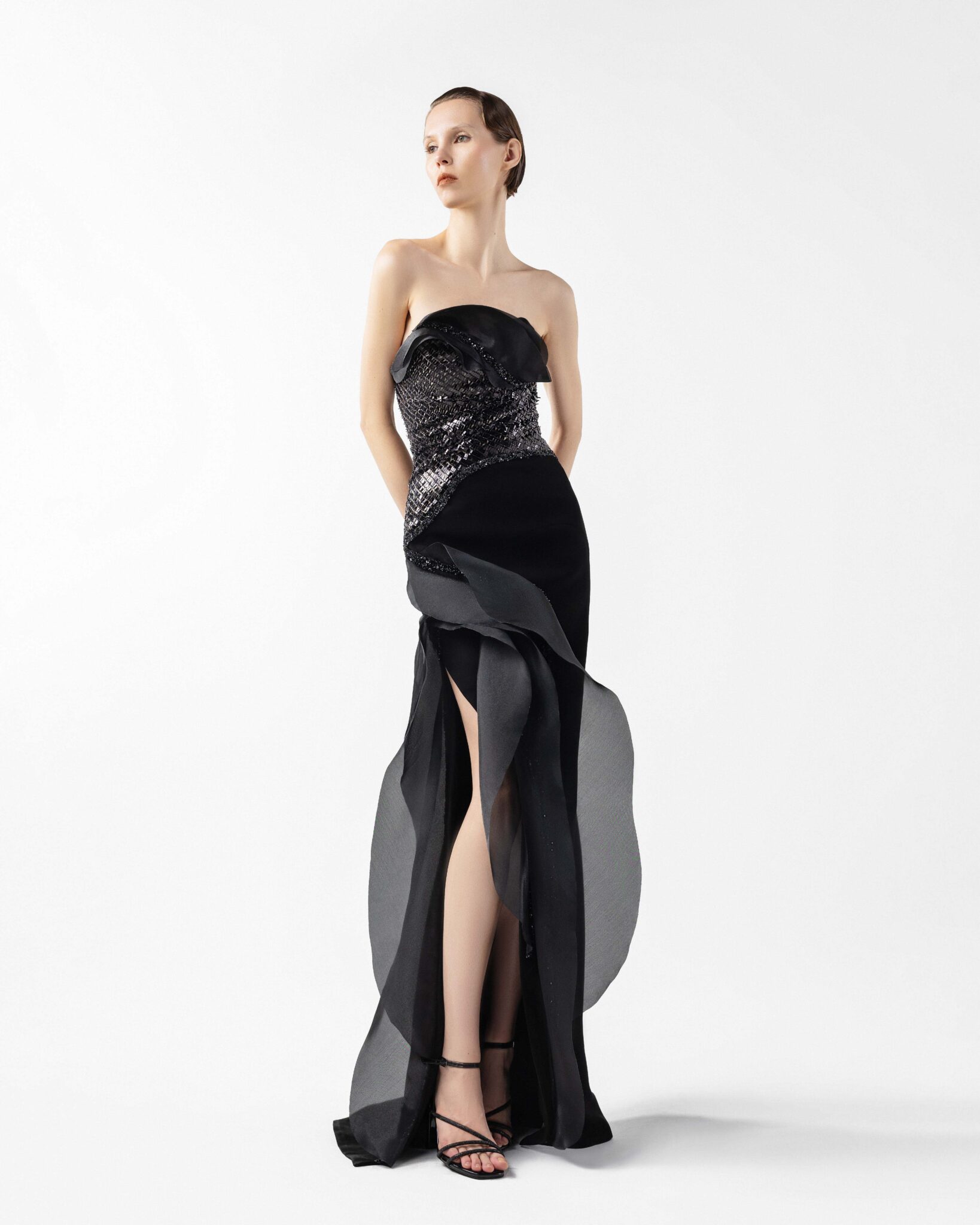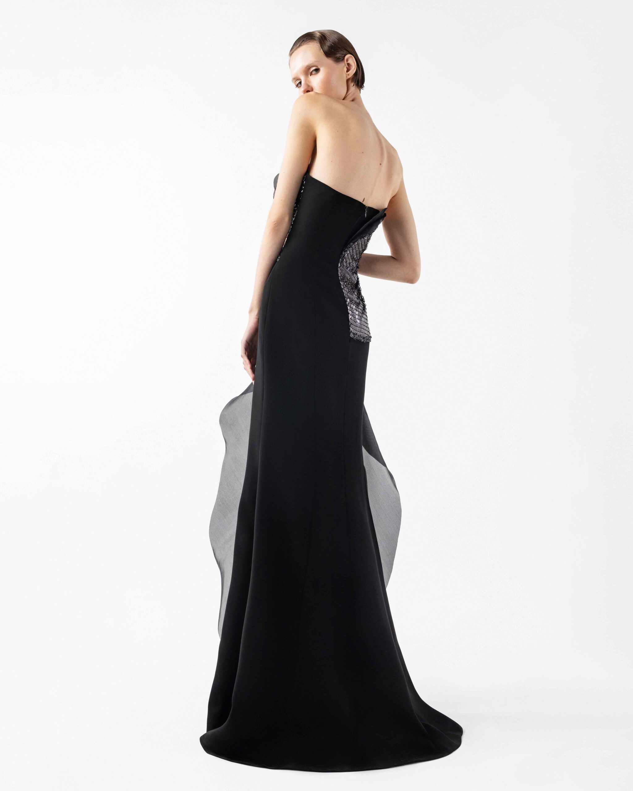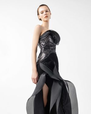 A bold interpretation of fluid form and texture, this strapless black gown is tailored in sleek crepe with a rounded bustline. Shimmering lace embellishes the bodice in an asymmetrical sweep, offering a striking contrast of shine and structure. Voluminous organza panels sculpt the neckline and flow into a cascading design that frames the high slit with ethereal movement. A statement of modern sophistication with a sculptural edge.