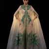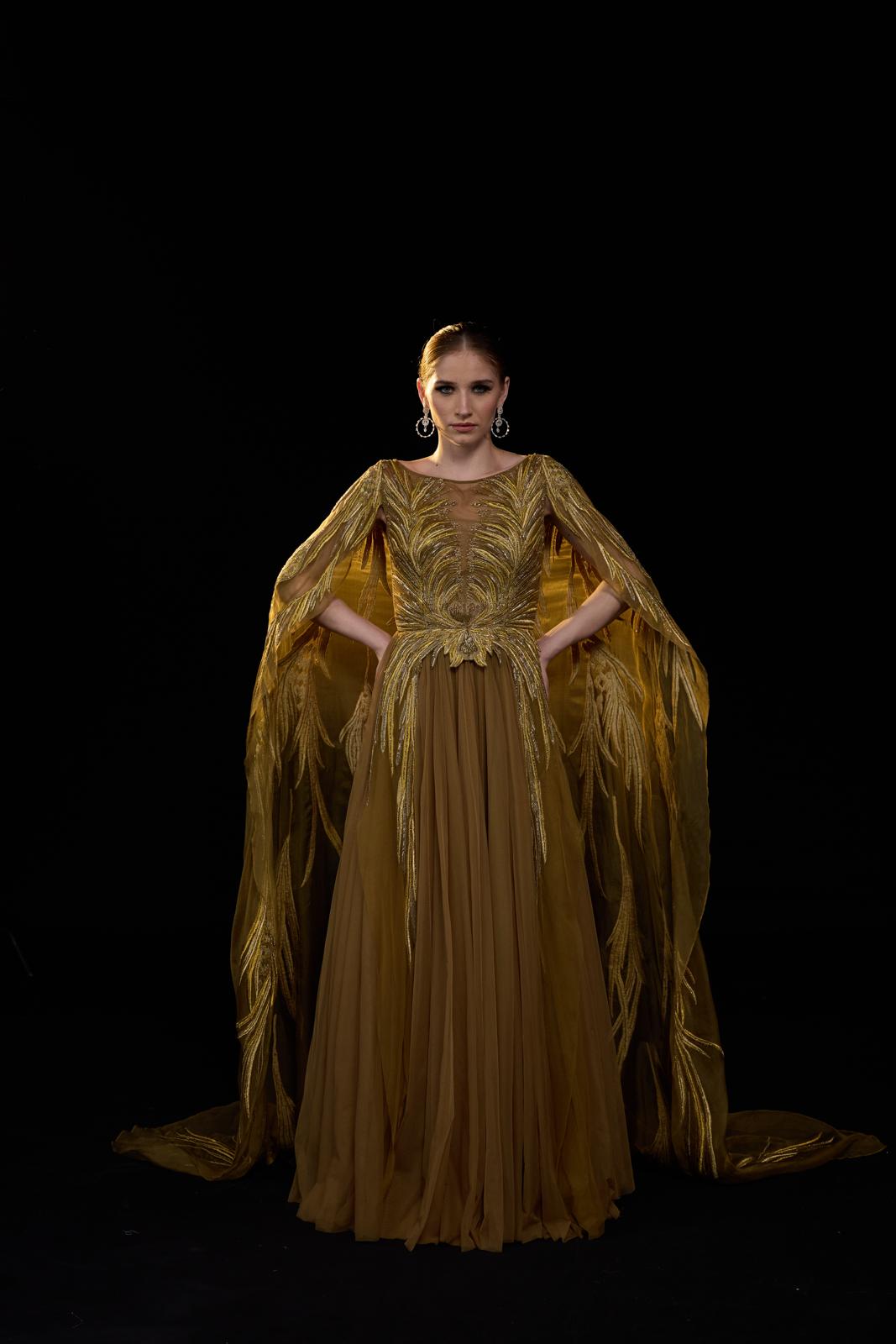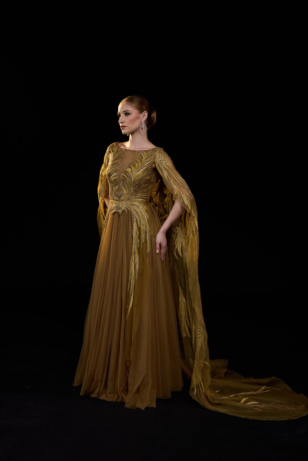 Striking evening gown, Golden-Bronze Embroidered with cape sleeves.