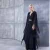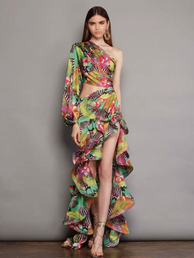 A one shoulder silhouette with a single long puff sleeve and a daring waist-cut out.