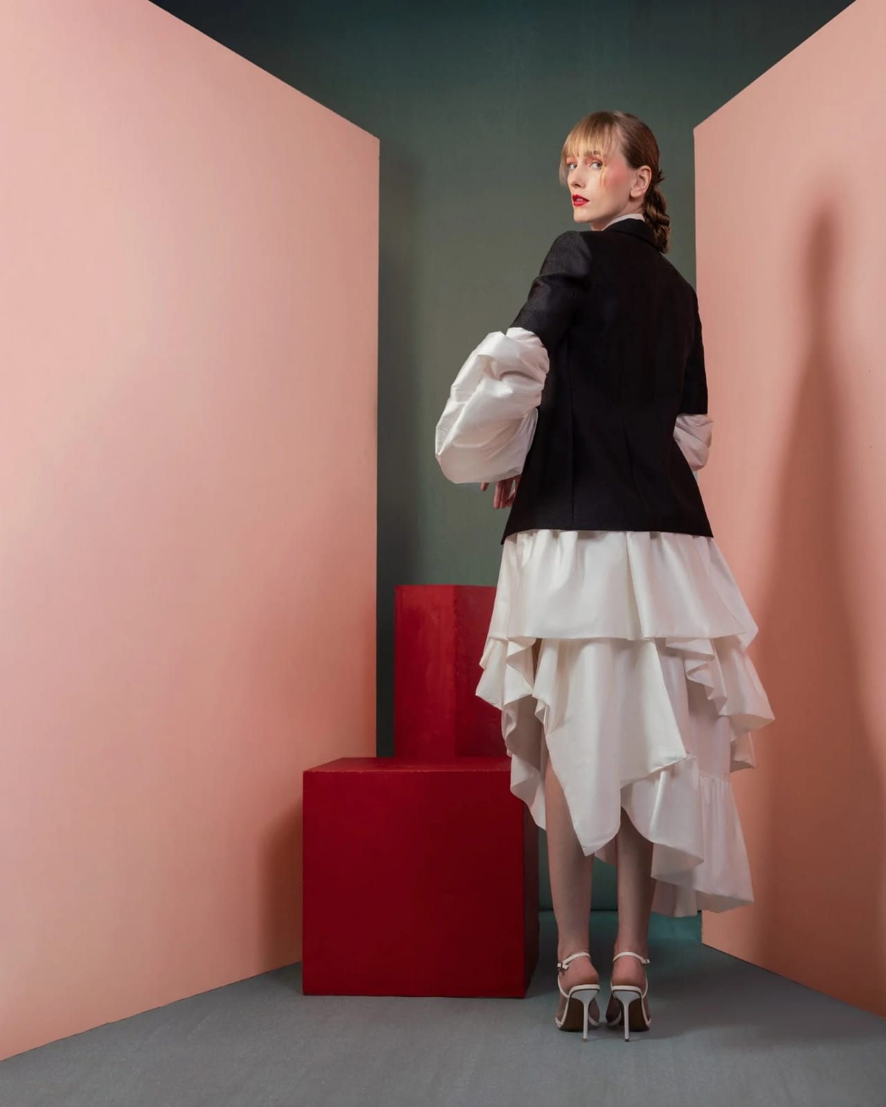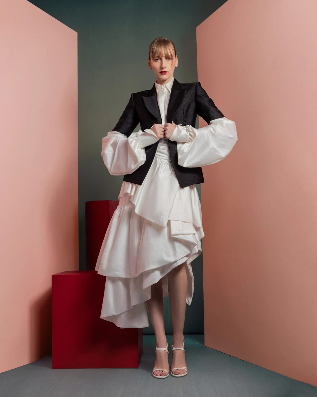 Make a statement with our high-low white taffeta skirt, featuring cascading layers with an asymmetrical hemline that adds movement and fluidity to the design. The high waist ensures a flattering fit, while the voluminous layers create a sense of grandeur. Pair it with our Jacket for a bold entrance at any event.