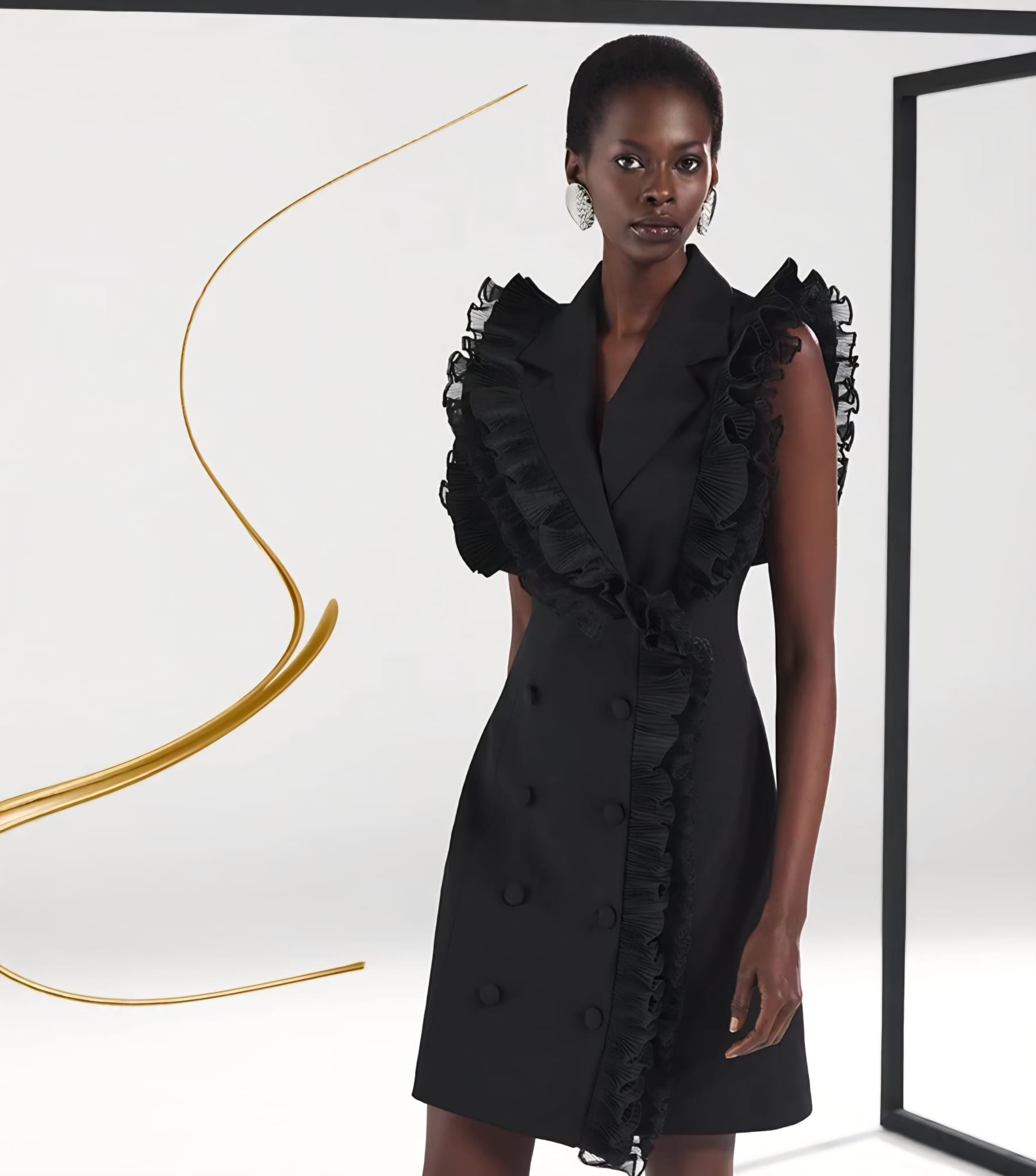 A black ruffled dress with a wrap-style design.