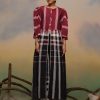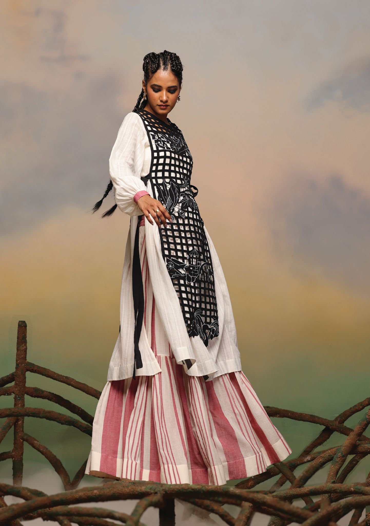A soft ivory khaadi kurta with bollowing sleeves lays the foundation, layered over a bold red and white stiped khaadi skirt.
