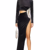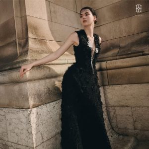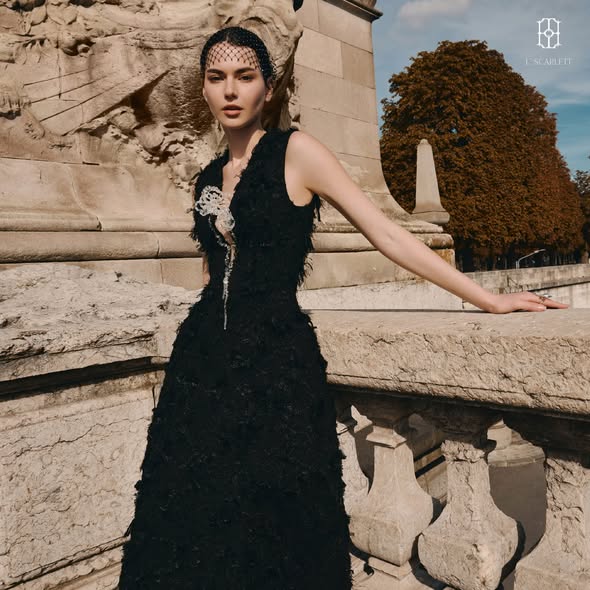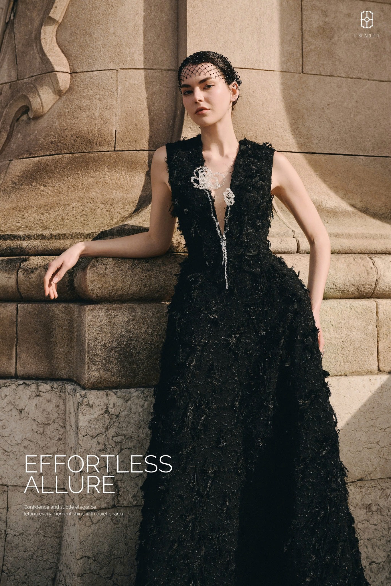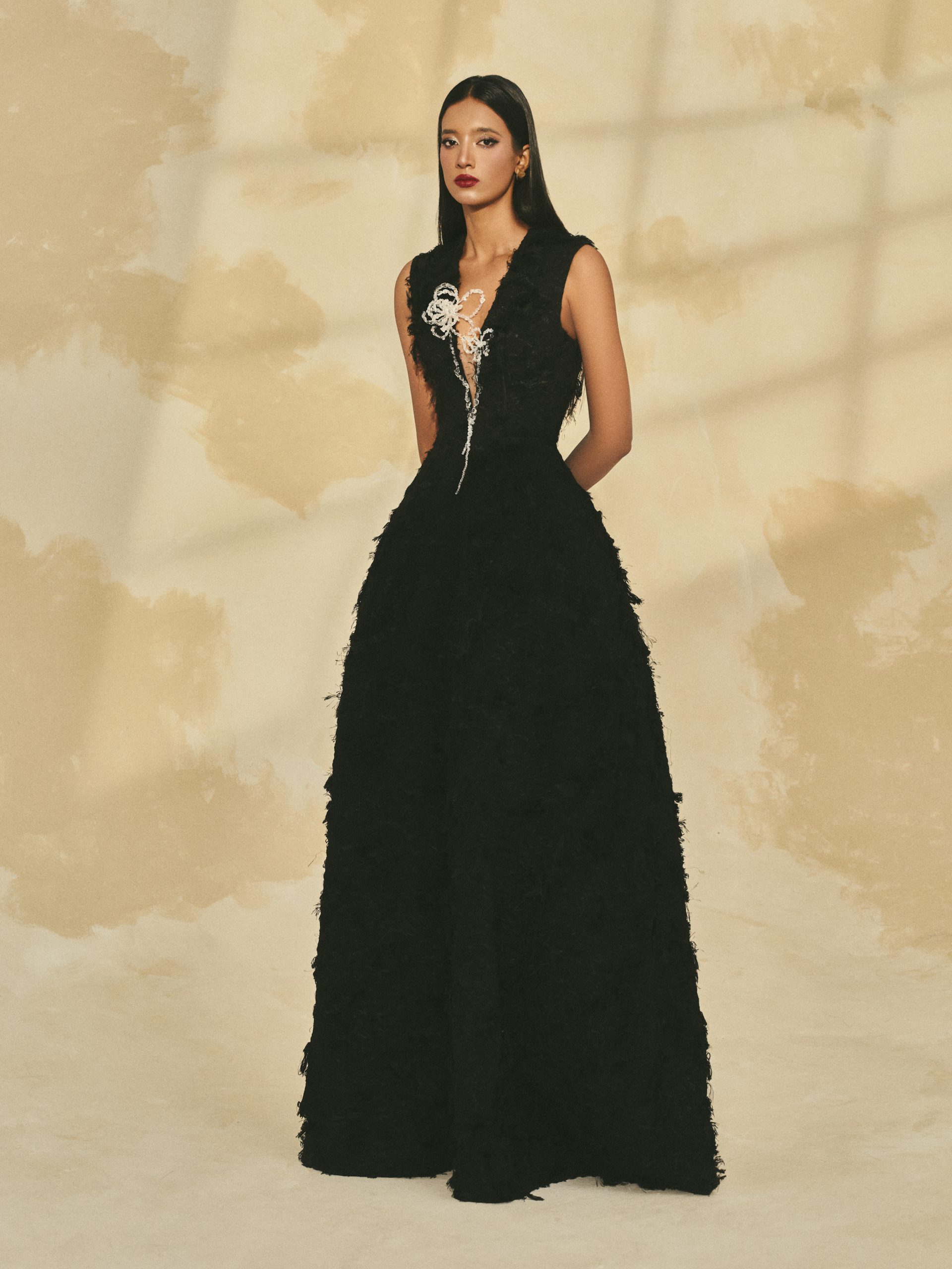A black sleeveless dress with a textured, shaggy overlay and a V- neckline decorative embellishments.