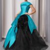 Evening gown with hand pleated silk top and bow details.