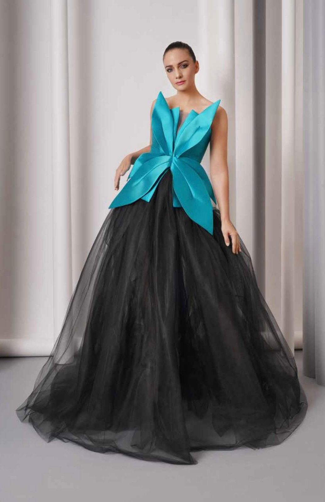 Cocktail dress with large tulle skirt and signature orchid leather corset.