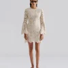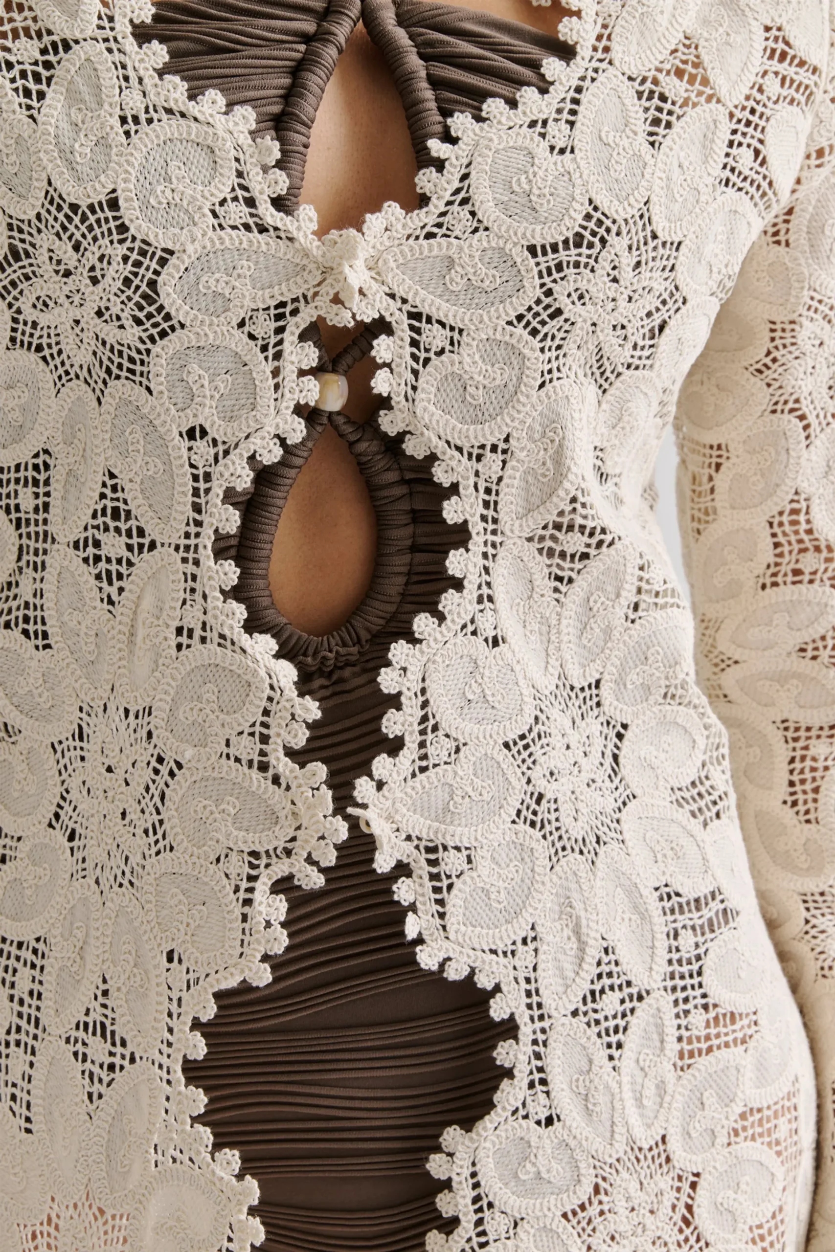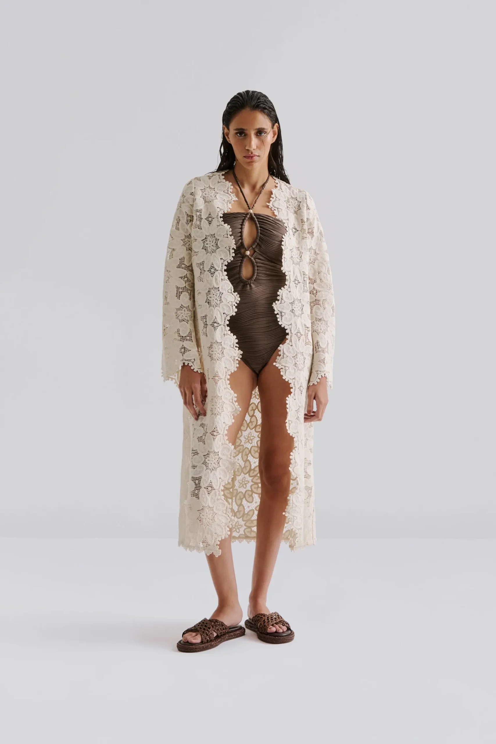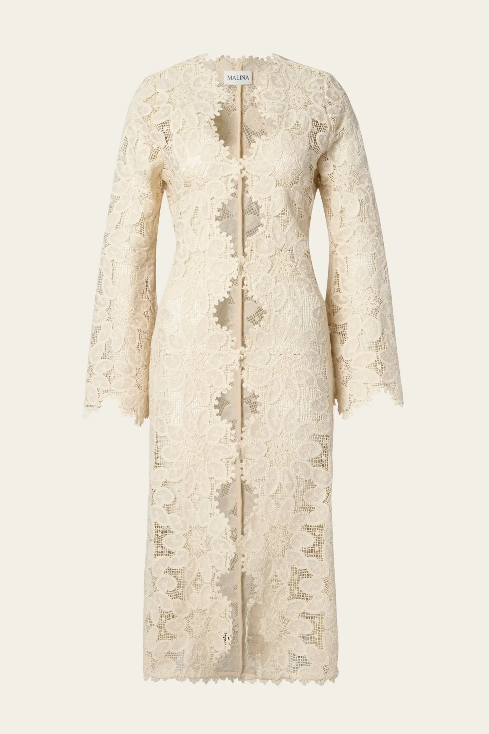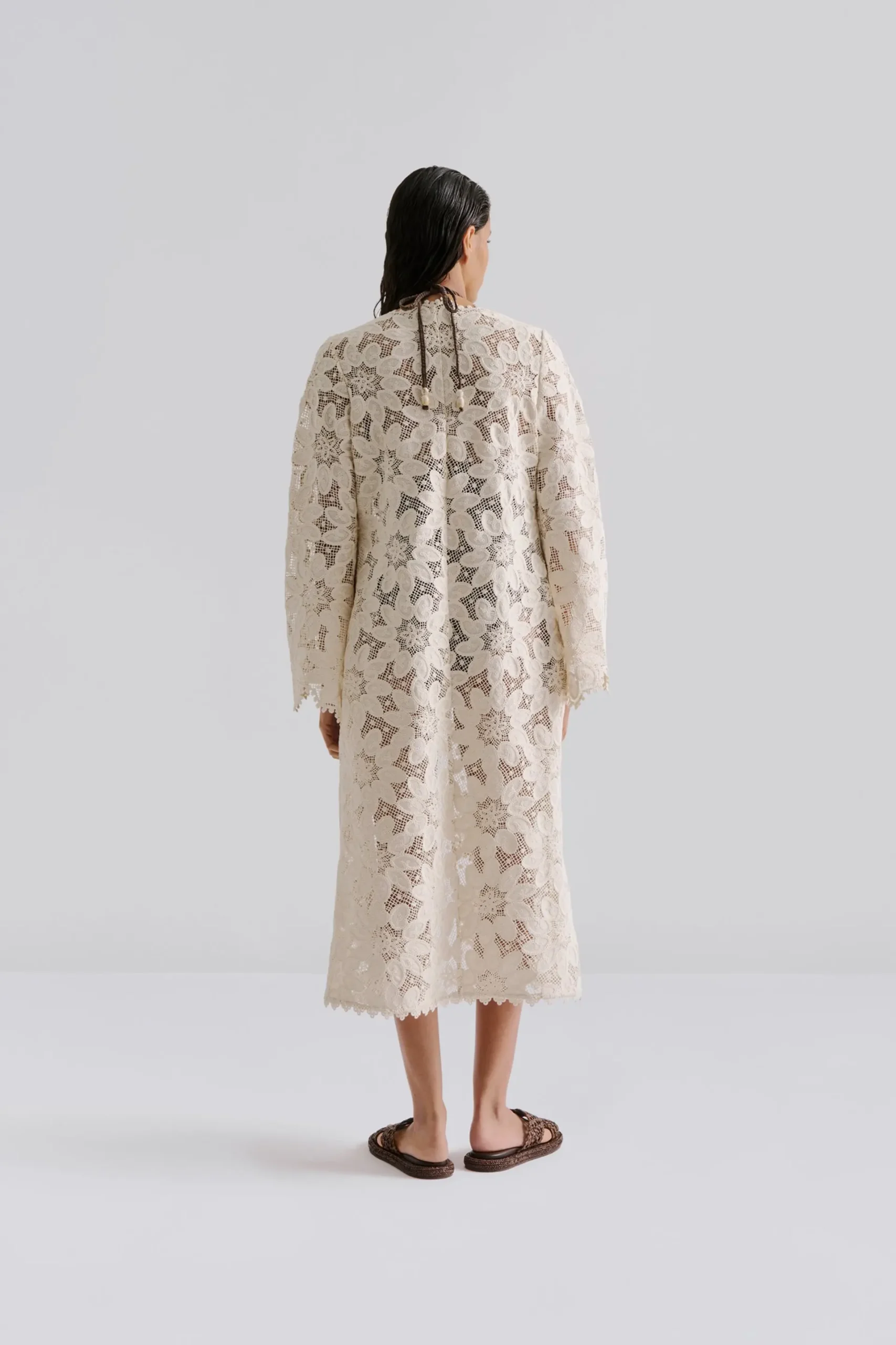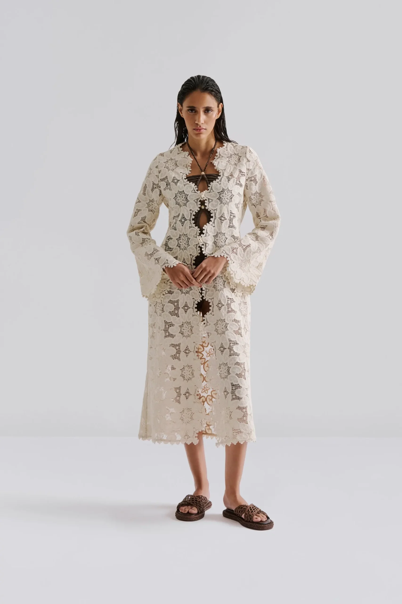 Guipure lace maxi kaftan with a flared sleeve and scalloped hems.